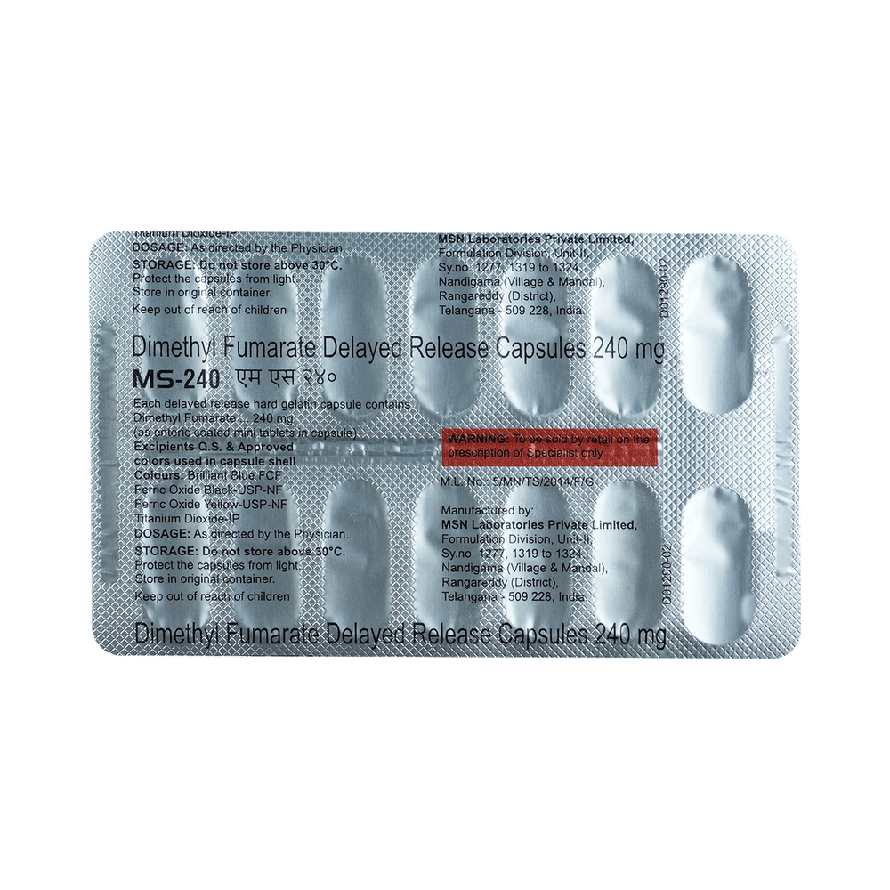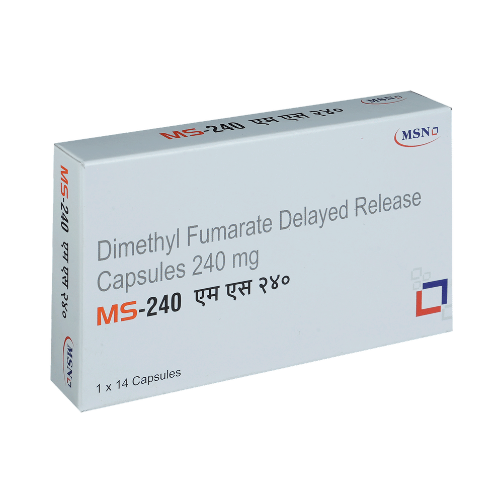 MS 240 Capsule DR is a medicine used in the treatment of multiple sclerosis (MS). It works by suppressing the inflammation and immune system that causes nerve damage in MS and helps reduce the worsening of the condition. However, it is not a cure for MS. MS 240 Capsule DR should be taken as advised by the doctor. You may take it with food to avoid an upset stomach. You may need to get regular blood and urine tests to monitor your blood cells, and kidney and liver function during treatment with this medicine. Take it regularly to get the most benefit from it. To help you remember, take it at the same time each day and do not stop taking until you have completed your dose.Some common side effects of this medicine include flushing, abdominal pain, diarrhea, nausea, vomiting, indigestion, gastritis, increased liver enzymes, and rash. If you experience any of these side effects that do not go away or get worse, let your doctor know. They may be able to suggest ways to prejudice or prevent them.Before using this medicine, tell your doctor if you have low white blood cell counts or an infection. Let your doctor also know of all the medical conditions and about the medicines you are taking to make sure it is safe for you. Pregnant and breastfeeding women should consult their doctor first before using this medicine as it may cause harmful effects to the developing baby.