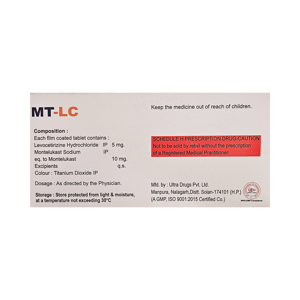 MT-LC Tablet is a combination medicine used in the treatment of allergic symptoms such as runny nose, stuffy nose, sneezing, itching, swelling, watery eyes and congestion or stuffiness. It also reduces inflammation in the airways and make breathing easier. MT-LC Tablet is taken with or without food in a dose and duration as advised by the doctor. The dose you are given will depend on your condition and how you respond to the medicine. You should keep taking this medicine for as long as your doctor recommends. If you stop treatment too early your symptoms may come back and your condition may worsen. Let your healthcare team know about all other medications you are taking as some may affect, or be affected by this medicine.The most common side effects are nausea, diarrhea, vomiting, dryness in the mouth, headache, skin rash, flu-like symptoms, and fatigue. Most of these are temporary and usually resolve with time. Contact your doctor straight away if you are at all concerned about any of these side effects. This medicine may cause dizziness and sleepiness, so do not drive or do anything that requires mental focus until you know how this medicine affects you. Avoid drinking alcohol while taking this medicine as it can worsen your sleepiness.Never support self-medication or recommend your medicine to another person. It is beneficial to have plenty of fluids while taking this medication. Before you start taking this medicine it is important to inform your doctor if you are suffering from kidney disease.