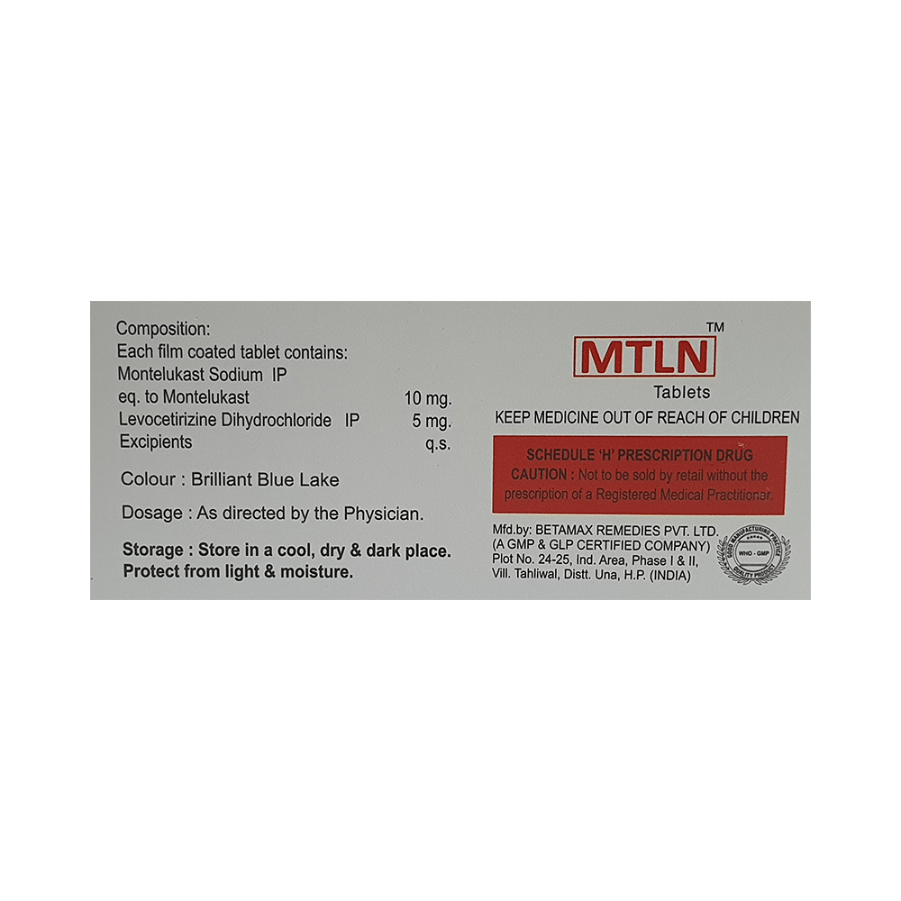 In Treatment of Allergic skin conditionsMtln Tablet is effective in treating allergic skin conditions with inflammation and itching. It reduces the actions of chemicals in the body that cause inflammation of the skin. When used correctly it is a safe and effective treatment. It reduces the redness, rash, pain or itchiness caused by your skin’s reaction to an irritant. It thus improves your self-esteem and confidence as your appearance changes. Keep taking it for as long as it is prescribed to get the full benefits.In Treatment of Sneezing and runny nose due to allergiesMtln Tablet is a combination medicine that provides relief from symptoms such as blocked or runny nose, sneezing and itchy or watery eyes. This will make it easier for you to go about your daily activities. It rarely has any serious side effects and you may only need to take it on days you have symptoms. If you are taking it to prevent getting symptoms you should use it regularly to get the most benefit.In Treatment of Hay feverHay fever, also called allergic rhinitis, causes cold-like signs and symptoms, such as a runny nose, itchy eyes, congestion, sneezing and sinus pressure. The only difference is that in hay fever, these symptoms are not produced due to a virus but are simply allergic responses of our body to allergens (allergy causing agents such as pollen). Mtln Tablet is used to provide relief from these symptoms of hay fever. It works by blocking the release of the chemical substance responsible for producing such allergy symptoms. Mtln Tablet is a safe medicine which helps treat hay fever and makes us feel at ease.show moreshow less