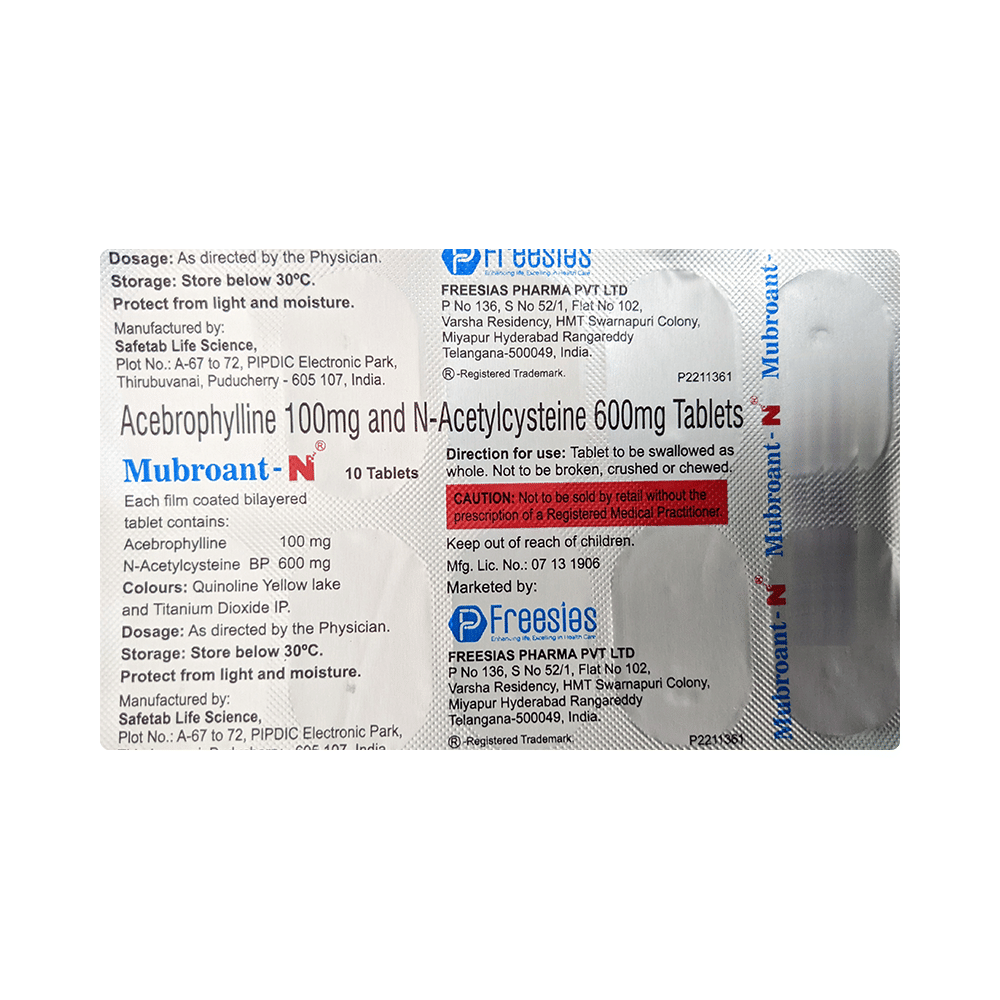 Mubroant-N Tablet is a combination of two medicines: Acebrophylline and Acetylcysteine. Acebrophylline is a mucolytic and bronchodilator. It works by relaxing the muscles of the airways and also thins and loosens mucus, making it easier to breathe. Acetylcysteine is a mucolytic medication. It thins and loosens mucus (phlegm), making it easier to cough out.