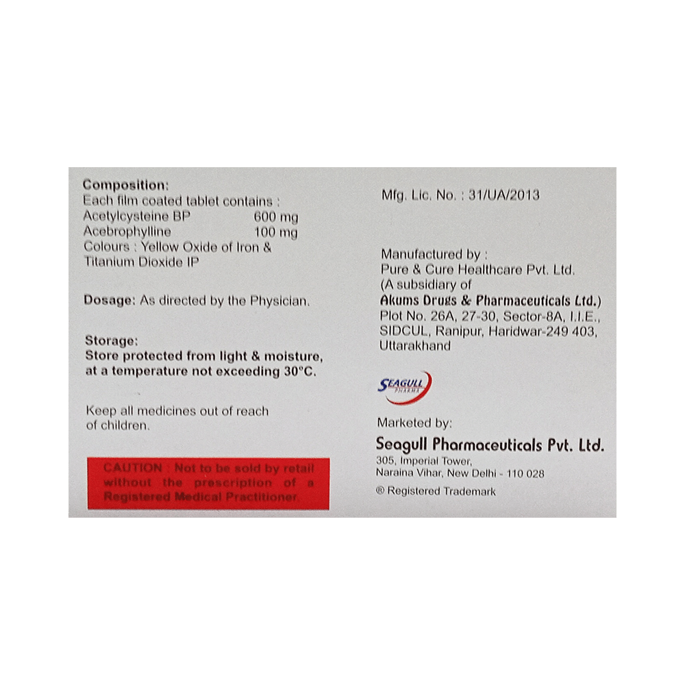 Salt Composition: Acebrophylline (100mg) + Acetylcysteine (600mg)