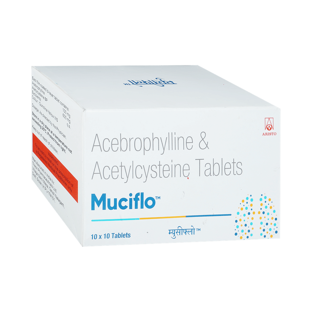 Muciflo Tablet is a combination of two medicines: Acebrophylline and Acetylcysteine. Acebrophylline is a mucolytic and bronchodilator. It works by relaxing the muscles of the airways and also thins and loosens mucus, making it easier to breathe. Acetylcysteine is a mucolytic medication. It thins and loosens mucus (phlegm), making it easier to cough out.