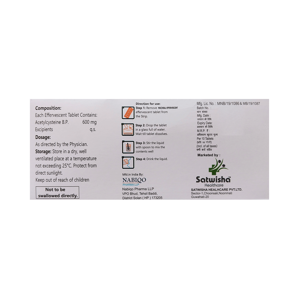 In Treatment of Respiratory disease with excessive mucusMuciheal 600 Effervescent Tablet Orange Sugar Free helps to loosen thick mucus, making it easier to cough out. This makes it easier for air to move in and out. It will relieve symptoms such as tightness in your chest, shortness of breath, wheezing, and coughing and help you carry out your daily activities more easily. This medicine is safe and effective. It usually starts to work within a few minutes and the effects can last up to several hours. Take it as prescribed by the doctor. Do not stop using it unless you are advised to by your doctor. Taking this medicine enables you to live your life more freely without worrying so much about things that set off your symptoms.