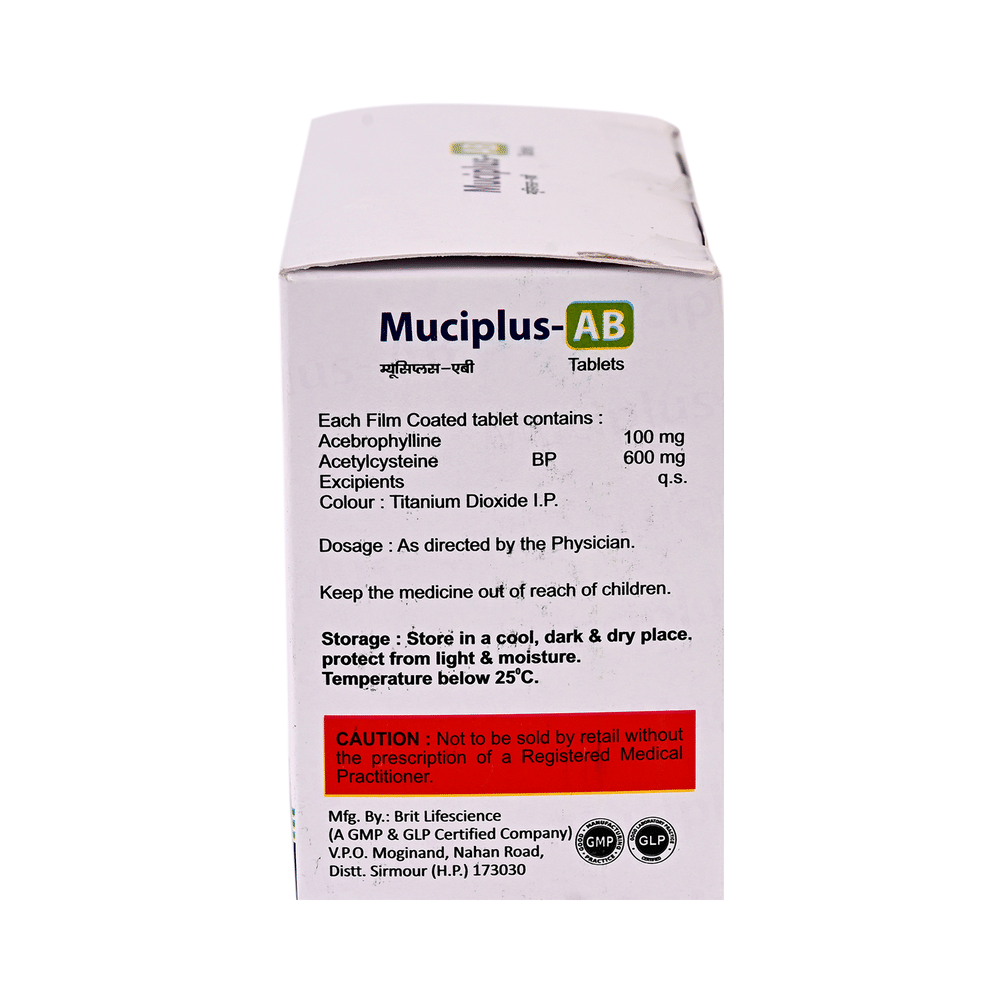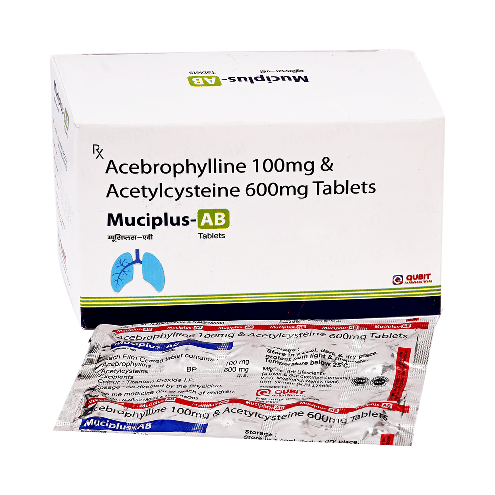 Muciplus-AB Tablet is used to treat and prevent asthma, symptoms of chronic obstructive pulmonary disorder, bronchitis, and complications of pulmonary cystic fibrosis. It helps relax the muscles of the air passages, thereby making it easier to breathe. Muciplus-AB Tablet is taken with or without food in a dose and duration as advised by the doctor. The dose you are given will depend on your condition and how you respond to the medicine. You should keep taking this medicine for as long as your doctor recommends. If you stop treatment too early your symptoms may come back and your condition may worsen. Let your healthcare team know about all other medications you are taking as some may affect, or be affected by this medicine.The most common side effects are nausea, vomiting, headache, and dizziness. Most of these are temporary and usually resolve with time. Contact your doctor straight away if you are at all concerned about any of these side effects. Avoid drinking alcohol while taking this medicine as that may cause excessive drowsiness.Never support self-medication or recommend your medicine to another person. Before you start taking this medicine it is important to inform your doctor if you are suffering from liver or kidney disease. You should also tell your doctor if you are pregnant, planning pregnancy, or breastfeeding.