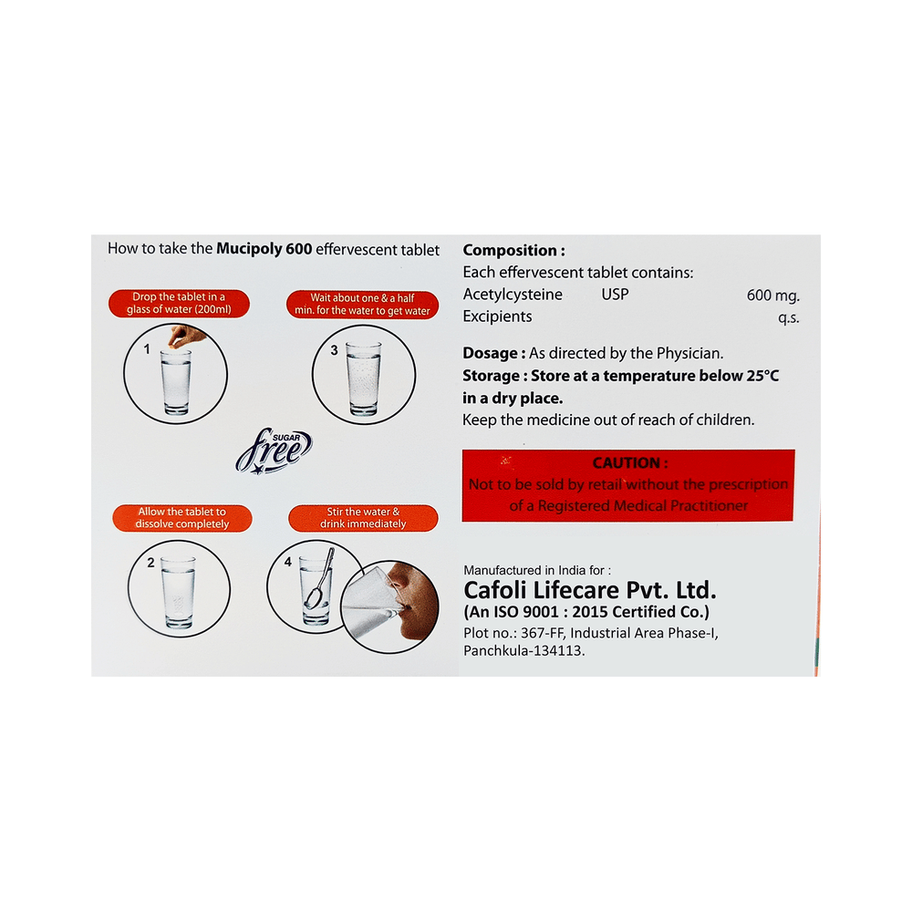Take this medicine in the dose and duration as advised by your doctor. Dissolve it in a glass of water before taking it. Mucipoly 600 Effervescent Tablet may be taken with or without food, but it is better to take it at a fixed time.