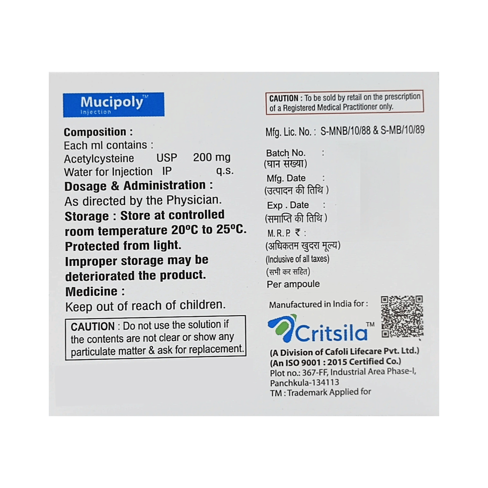 Mucipoly Injection is an antidote medication. It is used in the treatment of paracetamol overdose (when you may have taken too much paracetamol medicine). It protects your liver and helps to reduce the extent of the injury. Mucipoly Injection is given as an injection under the supervision of a doctor. It must be injected within 8 hours of a paracetamol overdose. It can be given up to 24 hours, but the medicine’s effectiveness slows down when given after 24 hours of the overdose. Your doctor will decide how much you need to improve your symptoms. Always follow your doctor's advice while taking this medicine.The most common side effects of this medicine include rash, urticaria, flushing, and itching. If these bother you or appear serious, let your doctor know. There may be ways of reducing or preventing them.Before taking this medicine, let your doctor know if you suffer from asthma, as close monitoring is required while taking this medicine. Your doctor should also know about all other medicines you are taking, as many of these may make this medicine less effective or change the way it works. Inform your doctor if you are pregnant, planning pregnancy, or breastfeeding.