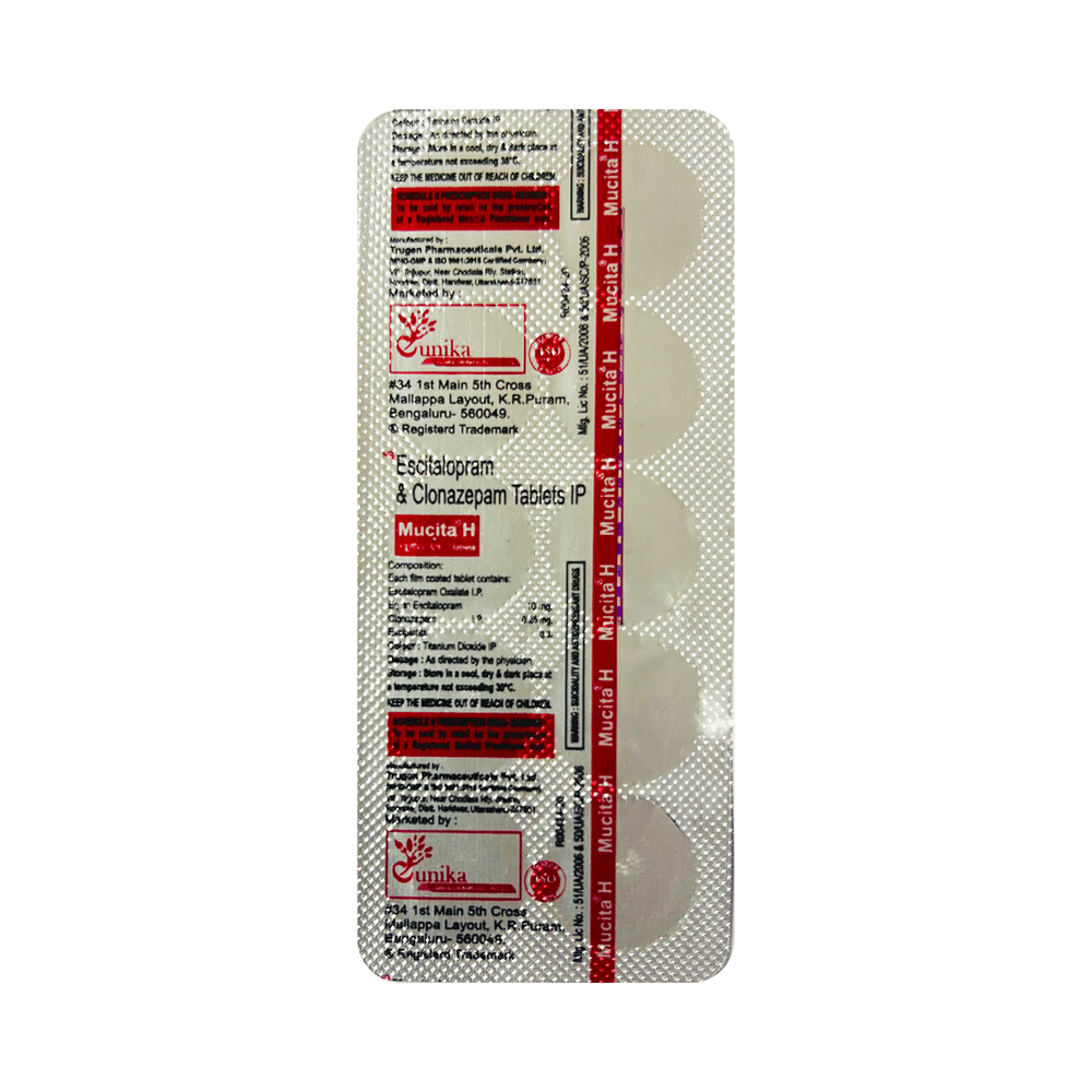Mucita H Tablet is a prescription medicine used to treat anxiety disorder. It is the combination medicine that calms the brain by decreasing the abnormal and excessive activity of the nerve cells. It also works by increasing the level of a chemical messenger in the brain which improves mood. Mucita H Tablet can be taken with or without food. However, it is advised to take it at the same time each day as this helps to maintain a consistent level of medicine in the body. Take this medicine in the dose and duration advised by your doctor as it has habit-forming potential. If you miss a dose of this medicine, take it as soon as you remember. Finish the full course of treatment even if you feel better. It is important not to stop taking this medicine suddenly as it may cause withdrawal symptoms.Some common side effects of this medicine include delayed ejaculation, low sexual desire, vomiting, memory impairment, depression, and confusion. It may also cause dizziness and sleepiness. So, do not drive or do anything that requires mental focus until you know how this medicine affects you. It may cause weight gain or weight loss depending upon person to person. To prevent weight gain, you can eat a balanced diet and exercise regularly. On the other hand, weight loss can be prevented by increasing food portions in your diet. It is important to inform your doctor if you develop any unusual changes in mood as it can cause suicidal thoughts.Take caution while taking medicine if you are suffering from liver disease. Your doctor should also know about all other medicines you are taking as many of these may make this medicine less effective or change the way it works. Inform your doctor if you are pregnant, planning pregnancy or breastfeeding.