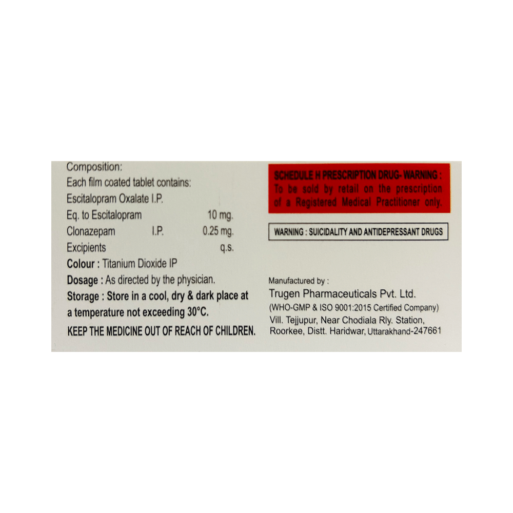 Salt Composition: Clonazepam (0.25mg) + Escitalopram Oxalate (10mg)