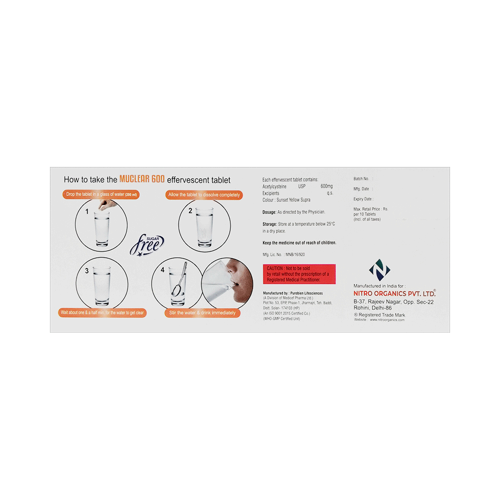 Muclear 600 Effervescent Tablet Orange Sugar Free is a prescription medicine used in the treatment of respiratory disease with excessive mucus. This medicine helps reduces mucus secretion in various lung diseases such as bronchitis, asthma, and emphysema. Muclear 600 Effervescent Tablet Orange Sugar Free can be taken with or without food, but take it at the same time to get the most benefit. It should be taken as your doctor's advice. The dose and how often you take it depends on what you are taking it for. Your doctor will decide how much you need to improve your symptoms. Dissolve the tablet in a glass of water and drink it immediately. Take this medicine for as long as it is prescribed for you.The most common side effects of this medicine include fever, nausea, vomiting, rash, and gastrointestinal discomfort. If these bother you or appear serious, let your doctor know. There may be ways of reducing or preventing them. Generally, it is advised to drink plenty of fluids while on treatment with this medicine.Before taking this medicine let your doctor know if you suffer from asthma, as close monitoring is required while taking this medicine. Your doctor should also know about all other medicines you are taking as many of these may make this medicine less effective or change the way it works. Inform your doctor if you are pregnant, planning a pregnancy, or breastfeeding.