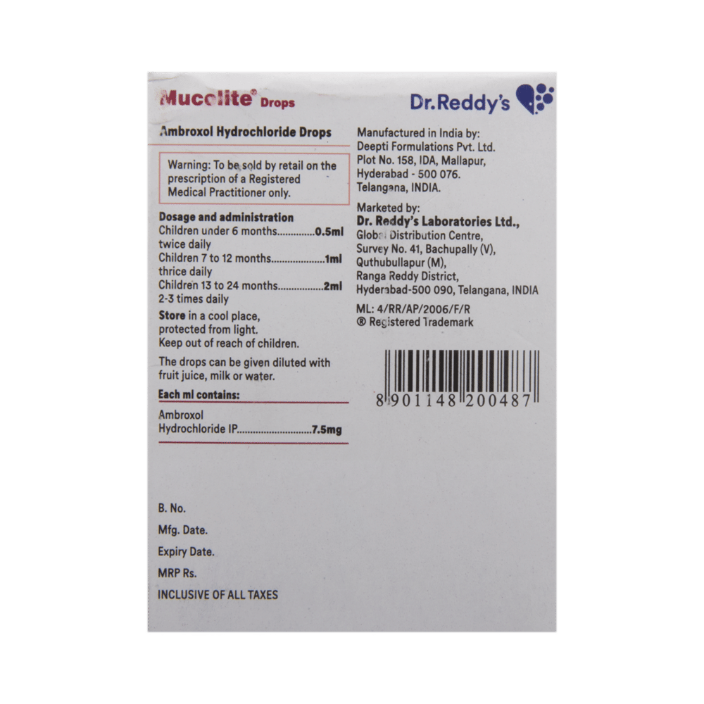 Mucolite Drops is a mucolytic medication. It thins and loosens mucus (phlegm) in the nose, windpipe, and lungs making it easier to cough out. Also, it relieves the pain and irritation due to sore and dry throat by rendering a soothing effect.