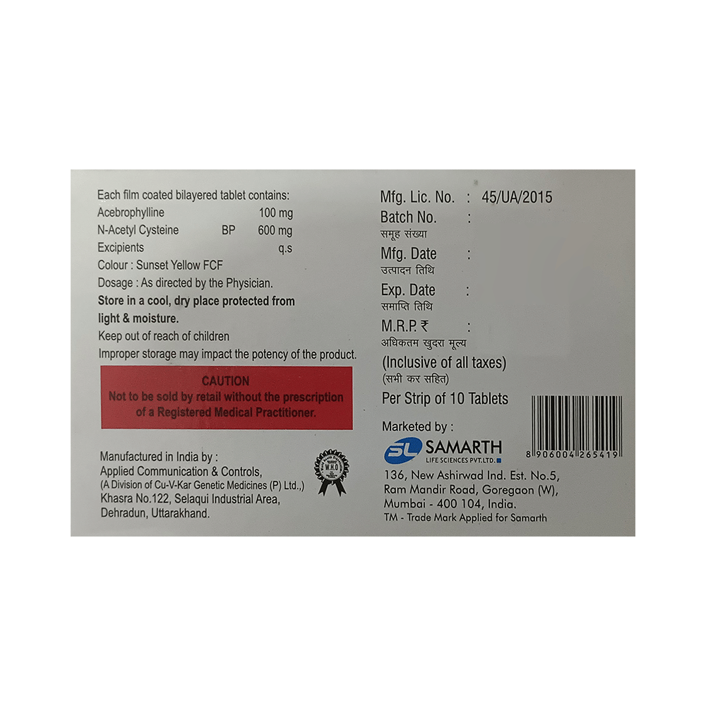 Salt Composition: Acebrophylline (100mg) + Acetylcysteine (600mg)