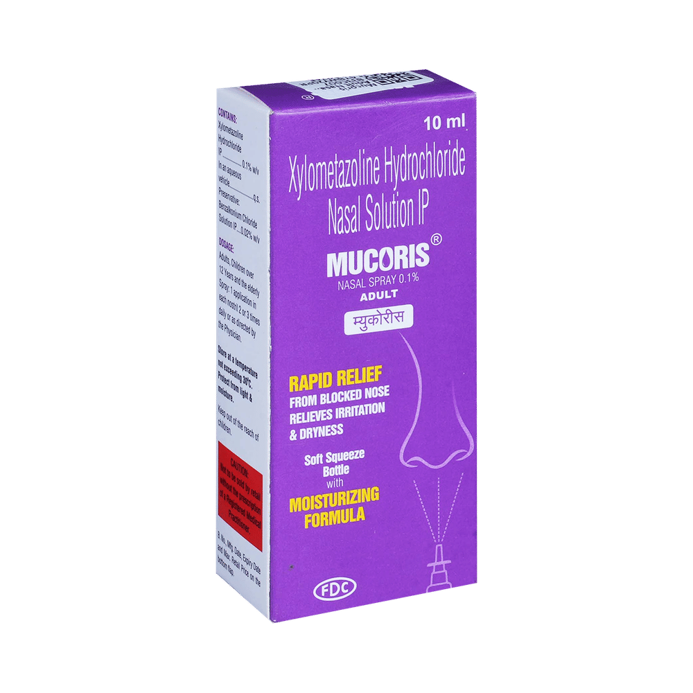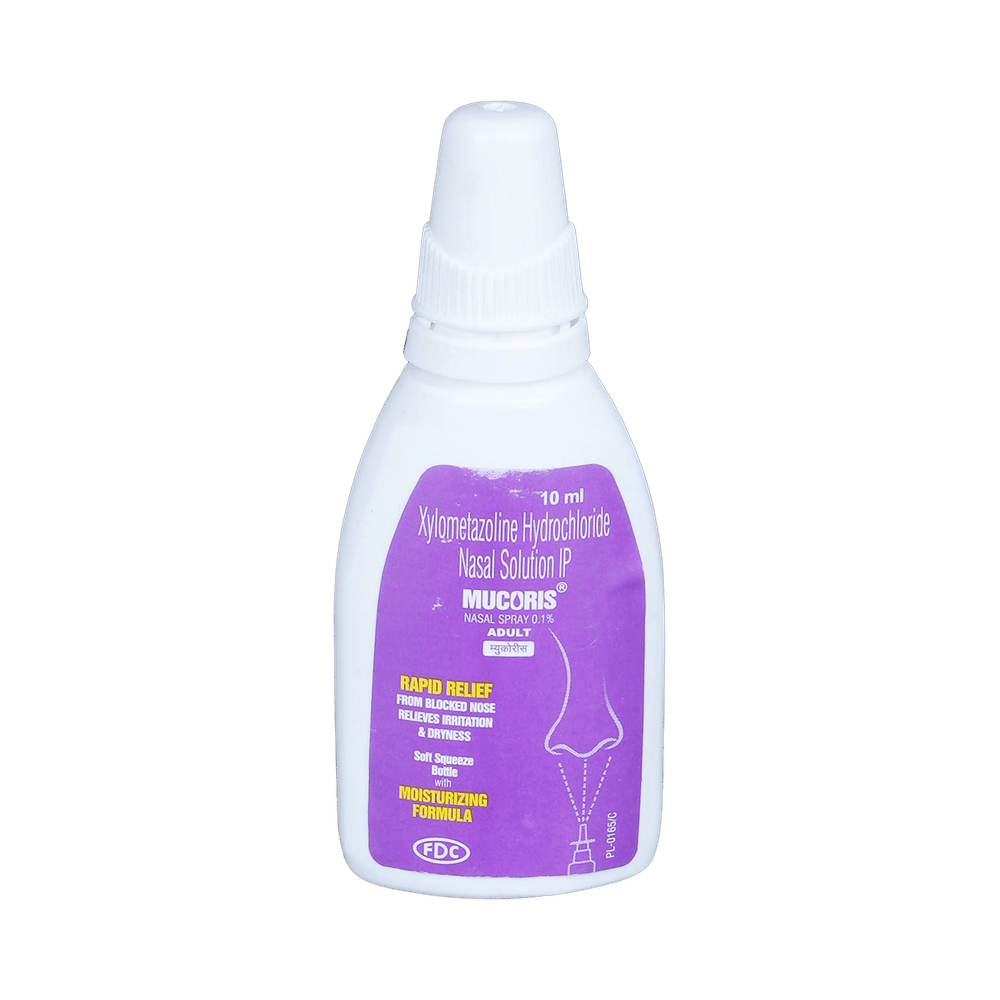 Mucoris Adult Nasal Spray is a medicine used to treat nasal congestion (blocked nose) caused by the common cold or flu, hay fever, and other allergies. It shrinks blood vessels in your nose to relieve nasal congestion and blockage. Mucoris Adult Nasal Spray should be used as you have been advised by your doctor. It provides only temporary relief so do not use it more often or for longer than recommended. Normally you should blow your nose gently before using it, keep one nostril closed while applying the medicine into the other, and then sniff hard to make sure it reaches deep into the nose. Then repeat for the other nostril. It provides relief very quickly and can last for several hours. If you use this medicine too often or for too long, it may worsen your symptoms rather than improve them.The most common side effects are burning sensation in the nose and throat, local irritation, nausea, headache, and dry nose. These are usually mild but if they bother you or do not go away, your doctor may be able to suggest ways of preventing or reducing them.It is generally a safe medicine but, before taking it, talk to your doctor about any health problems you have such as heart problems or high blood pressure (hypertension) or overactive thyroid gland or glaucoma, or prostate enlargement. Let your doctor know about any other medicines you are taking to make sure you are safe. Ask your doctor for advice before using this medicine if you are pregnant or breastfeeding.