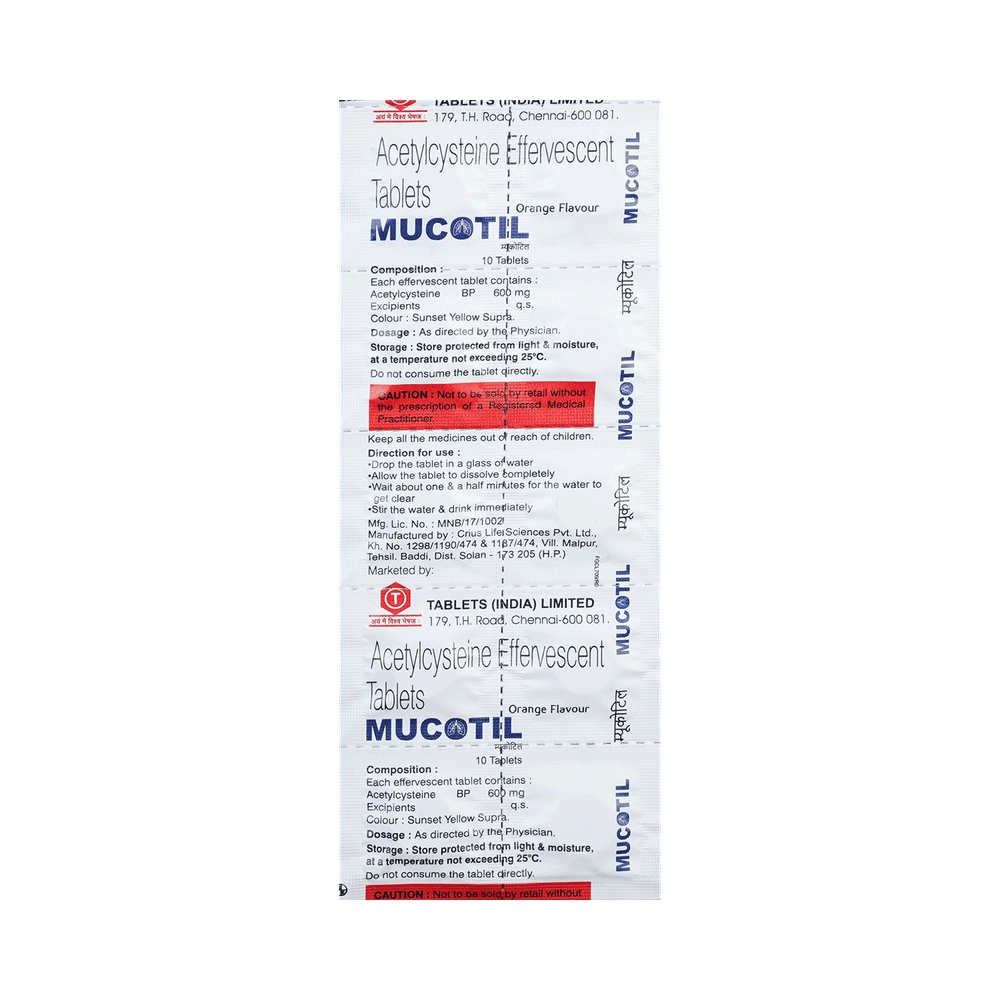 Take this medicine in the dose and duration as advised by your doctor. Dissolve it in a glass of water before taking it. Mucotil Effervescent Tablet Orange may be taken with or without food, but it is better to take it at a fixed time.