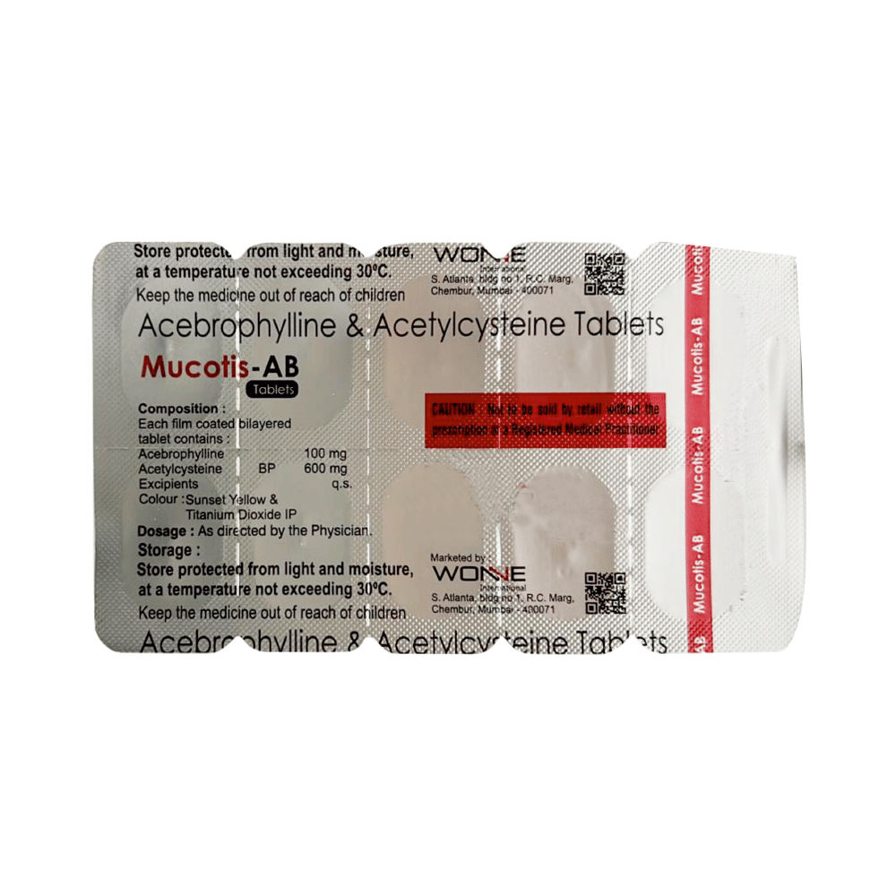 Mucotis-AB Tablet is a combination of two medicines: Acebrophylline and Acetylcysteine. Acebrophylline is a mucolytic and bronchodilator. It works by relaxing the muscles of the airways and also thins and loosens mucus, making it easier to breathe. Acetylcysteine is a mucolytic medication. It thins and loosens mucus (phlegm), making it easier to cough out.