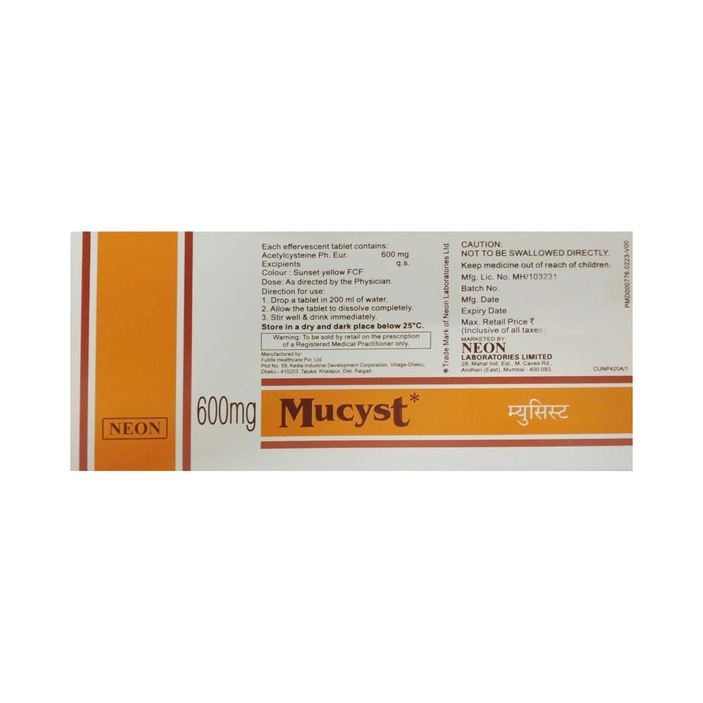 Mucyst 600mg Tablet is a prescription medicine used in the treatment of respiratory disease with excessive mucus. This medicine helps reduces mucus secretion in various lung diseases such as bronchitis, asthma, and emphysema. Mucyst 600mg Tablet can be taken with or without food, but take it at the same time to get the most benefit. It should be taken as your doctor's advice. The dose and how often you take it depends on what you are taking it for. Your doctor will decide how much you need to improve your symptoms. Dissolve the tablet in a glass of water and drink it immediately. Take this medicine for as long as it is prescribed for you.The most common side effects of this medicine include fever, nausea, vomiting, rash, and gastrointestinal discomfort. If these bother you or appear serious, let your doctor know. There may be ways of reducing or preventing them. Generally, it is advised to drink plenty of fluids while on treatment with this medicine.Before taking this medicine let your doctor know if you suffer from asthma, as close monitoring is required while taking this medicine. Your doctor should also know about all other medicines you are taking as many of these may make this medicine less effective or change the way it works. Inform your doctor if you are pregnant, planning a pregnancy, or breastfeeding.