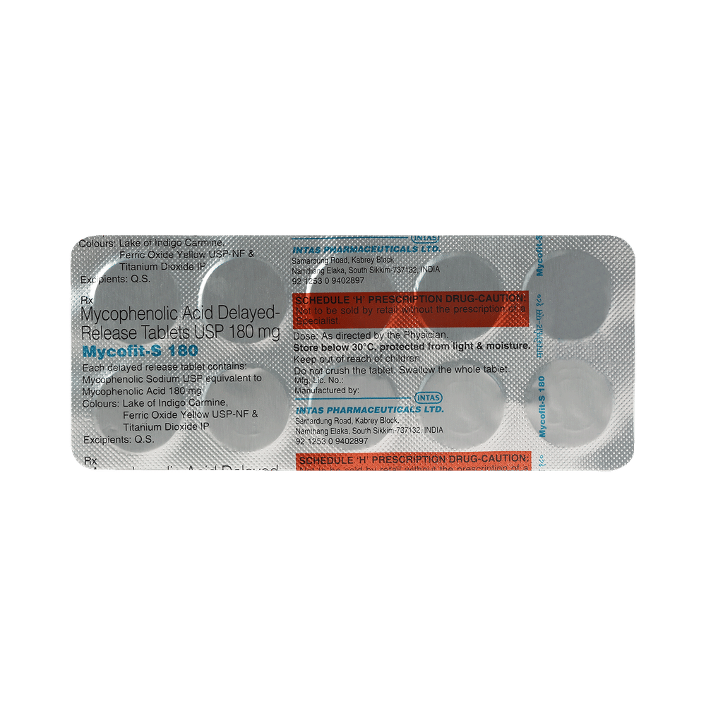 Mycofit-S 180mg Tablet DR belongs to a group of medicines called immunosuppressants. It is used with other medicines to prevent your body from rejecting an organ (such as a kidney, heart, or liver) after a transplant. It works by weakening your body’s immune system, so it does not attack the transplanted organ. The amount of Mycofit-S 180mg Tablet DR you take depends on the type of transplant you have. Follow your doctor’s instructions on this. This medicine may be taken with our without food. Swallow it as a whole, do not crush, chew, break, or open them. Take the medicine regularly to get the most benefit and keep taking it even if you feel well. If you stop taking it, you may increase the chances of rejecting your transplanted organ. The treatment will continue for as long as you need it to prevent rejection.The most common side effects of Mycofit-S 180mg Tablet DR are nausea, vomiting, diarrhea, stomach pain, headache, high blood pressure, and changes in the number of white blood cells. Because it suppresses your immune system, you may catch more infections than usual. There is also an increased risk of developing some cancers for this reason. There is a long list of potential side effects. You should ask your doctor about them and what signs to look out for because some can be serious and need urgent medical attention.This medicine can cause birth defects and miscarriages so do not take it if you are pregnant, planning to become pregnant, or breastfeeding. You should talk to your doctor before taking this medicine if you have any signs of infection, if you have any unexpected bruising or bleeding and if you have ever had a problem with your digestive system. Your doctor also needs to know what other medicines you are taking as there are many which interact with this medicine and affect the way it works. You will have regular tests to check for any changes in the number of your blood cells, inform your doctor if you notice unexplained bruising or bleeding, sore throat, mouth ulcers, or fever.