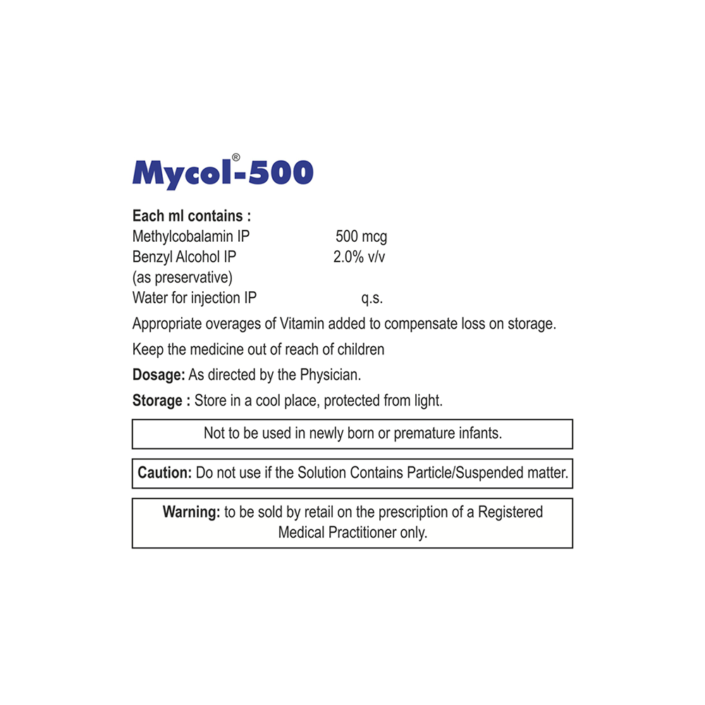 Mycol 500 Injection is a man-made form of vitamin B12. It is used to treat deficiency of vitamin B12 in the body. Vitamin B12 is important for growth, cell reproduction, blood formation, and protein and tissue synthesis. It also helps to treat anemia, fatigue, and numbness or tingling in the hands and feet. Mycol 500 Injection should be used exactly as prescribed by the doctor. Follow all directions on the prescription label and read all medication guides before use. You should use it regularly and at a fixed time each day to get the most benefit from it. This medicine may be only part of a complete program of treatment that also includes making changes to your diet and taking other medicines and supplements. Learn about the foods you should eat to make sure you get enough vitamin B12 in your diet.Mycol 500 Injection is generally safe and does not usually cause any common side effects. Some medicines can decrease the absorption of vitamin B12, let your doctor know all other medicines you are taking to make sure you are safe. To make sure it is safe for you, before using the medicine let your doctor also know if you have any medical conditions such as Leber's disease, liver disease, or kidney disorder.