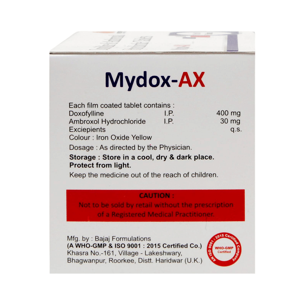 Mydox AX 400mg/30mg Tablet is used to treat asthma and chronic obstructive pulmonary disorder (a lung disorder in which the flow of air to the lungs is blocked). It helps in relaxing the muscles of the air passages and making it easier to breathe. Mydox AX 400mg/30mg Tablet also thins and loosens mucus in the nose, windpipe, and lungs making it easier to cough out. It is taken with or without food in a dose and duration as advised by the doctor. The dose you are given will depend on your condition and how you respond to the medicine. You should keep taking this medicine for as long as your doctor recommends. If you stop treatment too early your symptoms may come back and your condition may worsen. Let your healthcare team know about all other medications you are taking as some may affect, or be affected by this medicine.The most common side effects are nausea, stomach upset, vomiting, stomach pain, headache, irritability, insomnia, and increased heart rate. Most of these are temporary and usually resolve with time. Contact your doctor straight away if you are at all concerned about any of these side effects.Before taking it, you should tell your doctor if you have any kidney or liver diseases so that your doctor can prescribe a suitable dose for you. You should also tell your doctor if you are pregnant, planning pregnancy or breastfeeding.