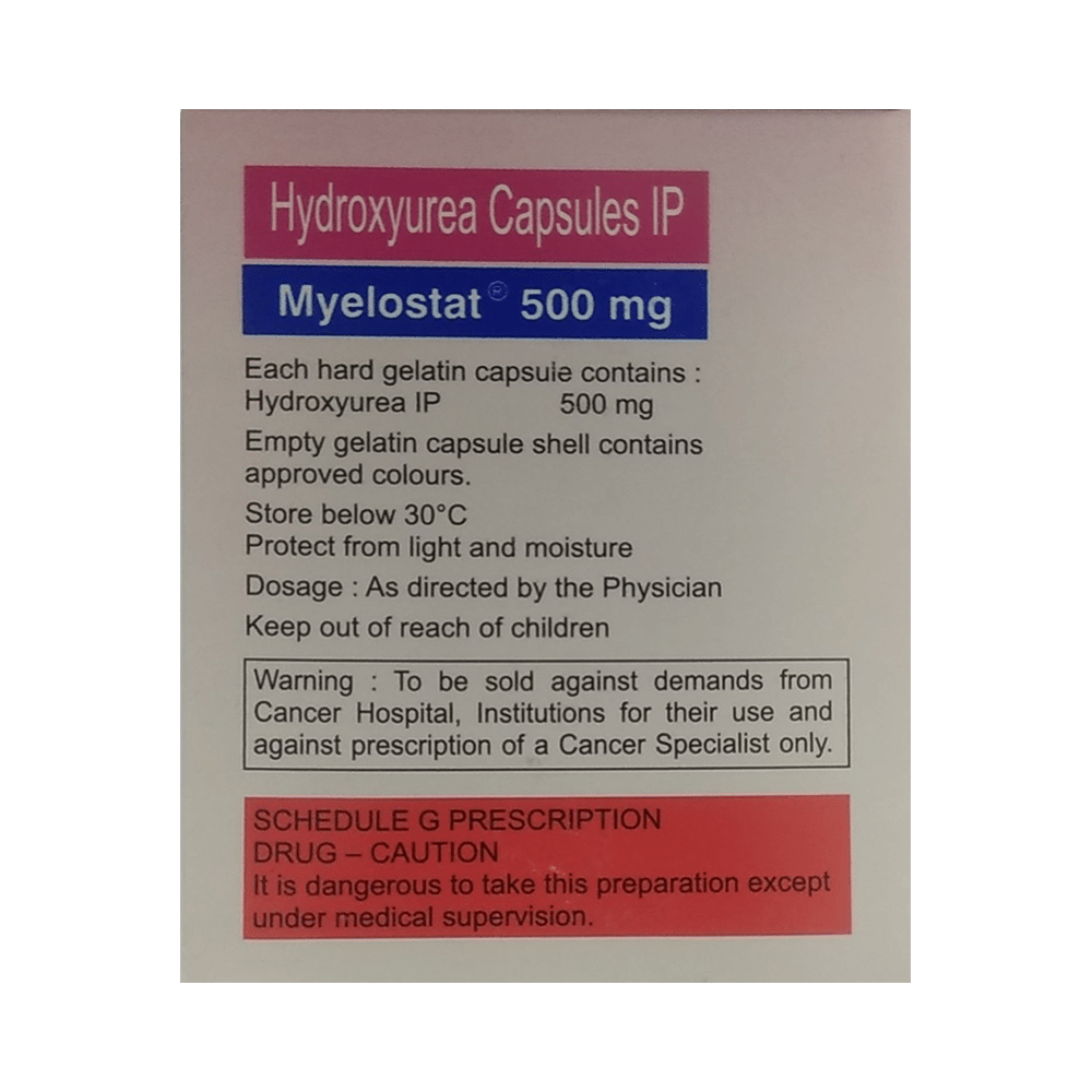 Myelostat 500mg Capsule is a medicine prescribed for the treatment of sickle cell disease. It helps reduce the frequency of painful crises and the need for blood transfusions. It is also used to treat certain types of cancer, including chronic myeloid leukemia (CML) and head and neck cancers. Myelostat 500mg Capsule may be taken with or without food. Take it exactly as prescribed by your doctor. Drink plenty of fluids while taking this medicine to stay well-hydrated. Regular follow-up visits and blood tests are necessary to monitor your response to the medicine and check for any side effects. Take folic acid supplements, if recommended by the doctor, as this medicine may reduce folate levels.Common side effects of Myelostat 500mg Capsule include loss of appetite, nausea, vomiting, diarrhea, constipation, and temporary hair loss. Some people may also experience low blood counts, leading to tiredness, infections, or easy bruising. If you notice fever, chills, unusual bleeding, or signs of infection, contact your doctor immediately. Staying well-hydrated and following your doctor’s advice can help reduce the risk of side effects.Myelostat 500mg Capsule should be used with caution and only under medical supervision. It should be avoided during pregnancy unless clearly necessary, as it may harm the unborn baby. Women of childbearing age should use effective contraception during treatment and for a period after stopping the drug. Men are also advised to use contraception during and after treatment, as the drug may affect sperm production.Myelostat 500mg Capsule may not be suitable for people with severe bone marrow problems or significant liver or kidney disease. Avoid live vaccines during treatment and limit exposure to people who are sick. Always inform your doctor about any other medicines or supplements you are taking before starting Myelostat 500mg Capsule.