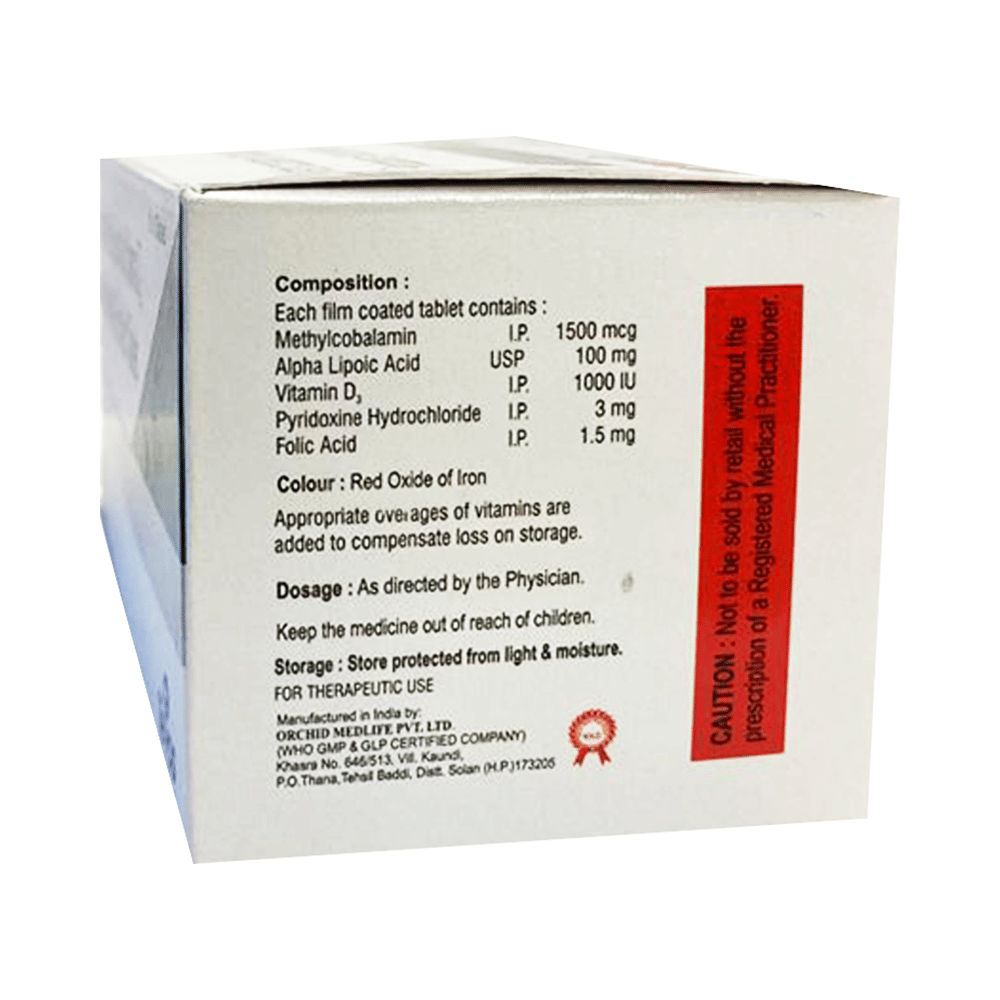 Salt Composition: Methylcobalamin (1500mcg) + Alpha Lipoic Acid (100mg) + Vitamin B6 (Pyridoxine) (3mg) + Folic Acid (1.5mg) + Vitamin D3 (1000IU)