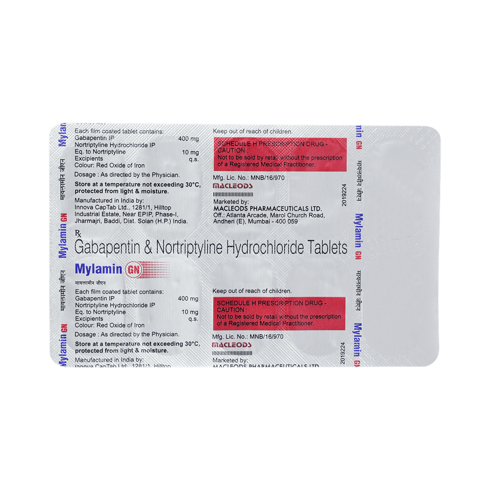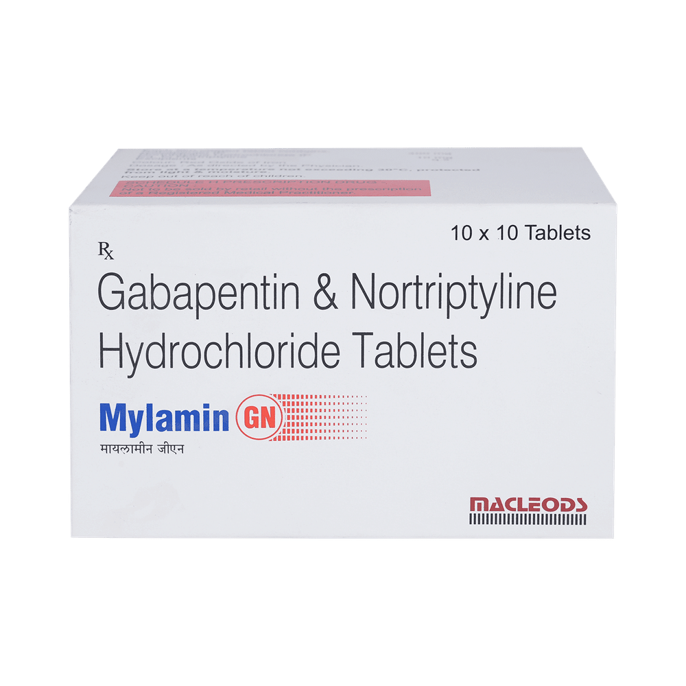 Mylamin GN Tablet is a combination of two medicines: Gabapentin and Nortriptyline. Gabapentin is an alpha 2 delta ligand which decreases the pain by modulating calcium channel activity of the nerve cells. Nortriptyline is a tricyclic antidepressant which increases the levels of chemical messengers (serotonin and noradrenaline) that stop the movement of pain signals in the brain. Together, they relieve neuropathic pain (pain from damaged nerves).