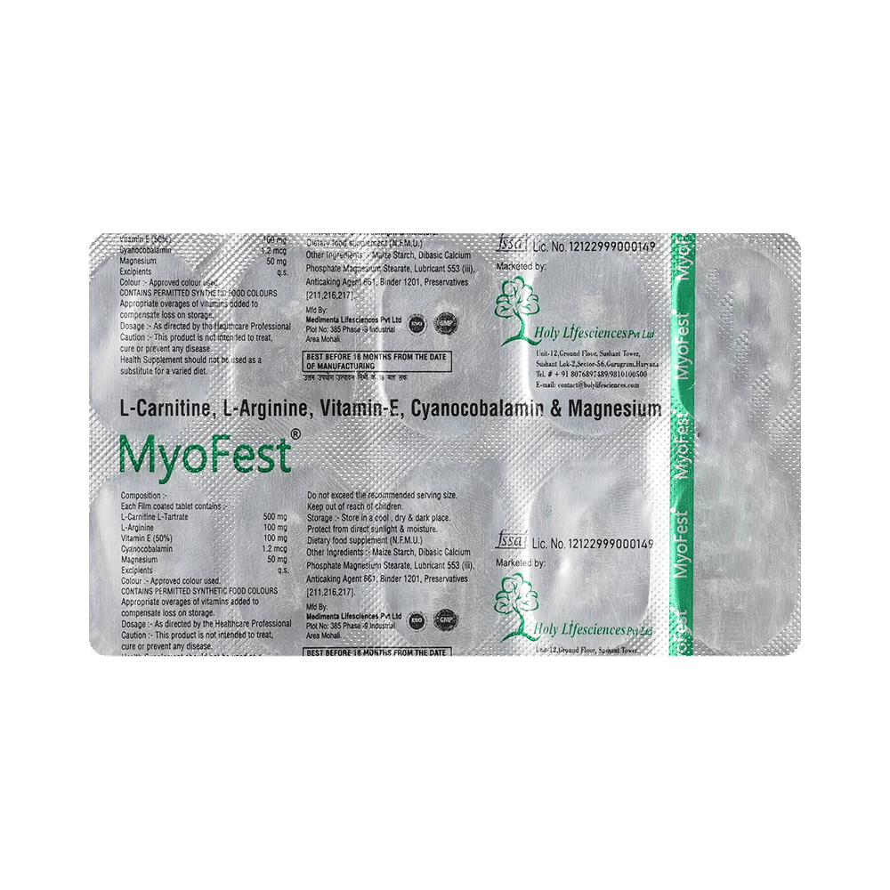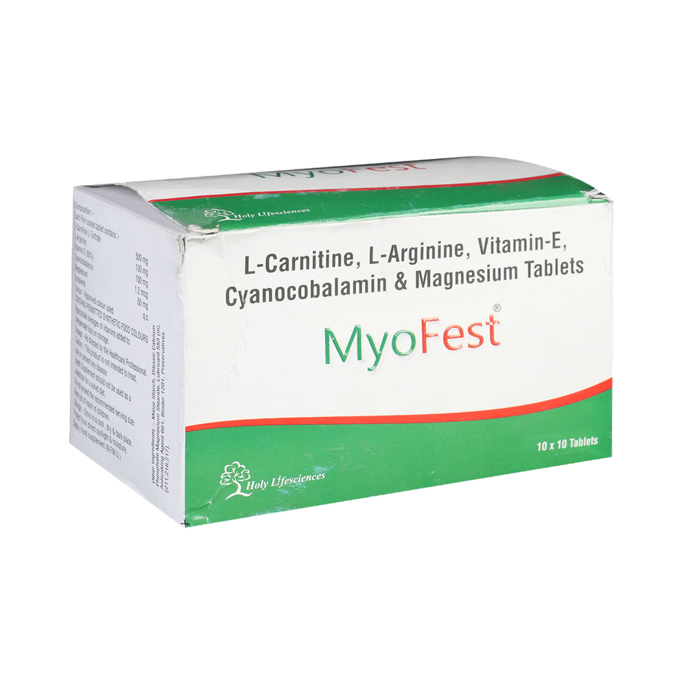 Myofest Tablet is a combination of four nutritional supplements: Levo-carnitine, L-Arginine, Vitamin E and Methylcobalamin which replenish the body's stores of important nutrients.