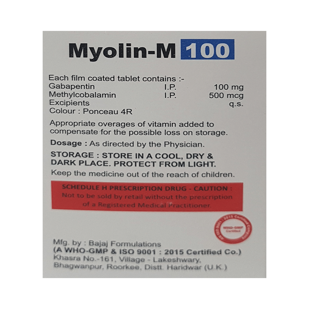 Myolin-M 100 Tablet is a combination medicine used for the treatment of neuropathic pain. This medicine decreases pain by modulating calcium channel activity of the nerve cells. Myolin-M 100 Tablet is taken by mouth with or without food, preferably at bedtime. It is advised to take medicine at the same time each day as this helps to maintain a consistent level of medicine in the body. Take this medicine in the dose and duration advised by your doctor. If you miss a dose of this medicine, take it as soon as you remember. Finish the full course of treatment even if you feel better. It is important that this medication is not stopped suddenly without talking to the doctor.Some common side effects of this medicine are nausea, peripheral edema, ataxia, blurred vision, fever and nystagmus (involuntary eye movement). It may also cause dizziness and sleepiness, so do not drive or do anything that requires mental focus until you know how this medicine affects you. It is important to inform your doctor if you develop any unusual changes in mood or behavior, new or worsening depression, or suicidal thoughts.Before taking the medicine you should tell your doctor if you are pregnant, planning to become pregnant, or breastfeeding. It can usually be mixed safely with other medicines but some drugs (including antacids and alcohol) do affect the way it works and can increase the chance of side effects.