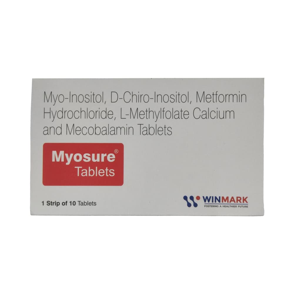 Myosure Tablet is a combination of medicines used in the treatment of polycystic ovarian syndrome (PCOS). It regulates ovulation and menstrual cycles (periods) in PCOS. It enhances the body's response to insulin, and maintains hormonal balance. This improves your overall health. Myosure Tablet should be taken in the dose and duration as advised by your doctor. It is to be taken with food, preferably at the same time each day. If you miss a dose, take it as soon as possible. However, if it is almost time for your next dose, skip the missed dose and go back to your regular schedule. Do not double the dose.It may cause side effects like taste change, nausea, vomiting, diarrhea, stomach pain, loss of appetite, and hypoglycemia (low blood sugar). However, these are temporary and usually subside on their own. Please consult your doctor in case these do not resolve or persist for a longer duration.Before taking this medicine, inform your doctor if you have any kidney, liver or heart problems. Pregnant or breastfeeding women should also consult their doctor before taking it. Your doctor will check your kidney function tests before starting treatment with it. Avoid excessive alcohol intake while taking it as this may increase the risk of developing some side effects.