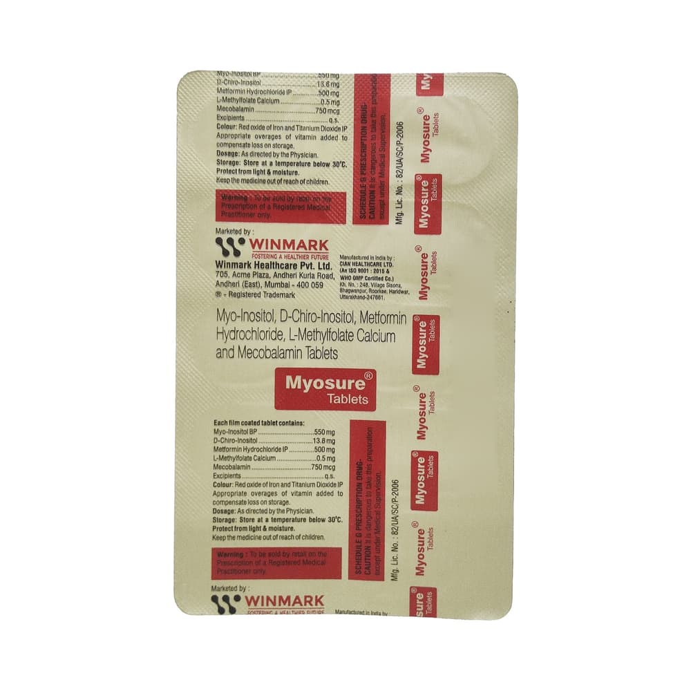 Myosure Tablet is a combination of five medicines: Myo-Inositol, D-Chiro Inositol, Metformin, L-Methyl Folate Calcium and Methylcobalamin. These medicines work by enhancing body’s response to insulin and decreasing high levels of a harmful substance (homocysteine). This effect improves hormone balance and leads to more regular ovulation and menstrual cycles (periods) in PCOS.