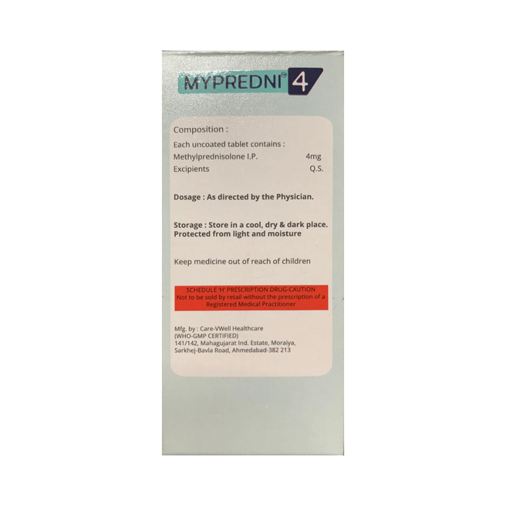 Mypredni 4 Tablet is a medicine used to treat a wide variety of medical conditions such as severe allergic conditions, asthma, rheumatic disorder, skin and eye disorders, and systemic lupus erythematosus. It provides relief by preventing the release of substances that cause inflammation. Mypredni 4 Tablet should be taken with food. This will prevent you from getting an upset stomach. The dose and duration will depend on what you are being treated for. You should always take the amount prescribed. Do not take a larger dose or use it more often. Keep taking it regularly even if you feel well. Some conditions will become worse if you stop using this medicine.The most common side effects of this medicine include skin thinning, increased risk of infection, reduction in bone density, and mood changes. If these side effects bother you or do not go away, your doctor may suggest ways of preventing or reducing them. The use of this medicine may lower your ability to fight infections so avoid being near people who might pass on infections such as measles, chickenpox, or flu.Before using this medicine, you should tell your doctor if you have brittle bones (osteoporosis), mood disorders, high blood pressure, or liver disease. Also, tell your doctor if you have diabetes, this medicine may increase blood glucose levels which can cause or worsen diabetes. Many other drugs may affect, or be affected by, this medicine so let your doctor know all other medicines you are using, to make sure it is safe. You should also tell your doctor if you are pregnant, planning pregnancy or breastfeeding.