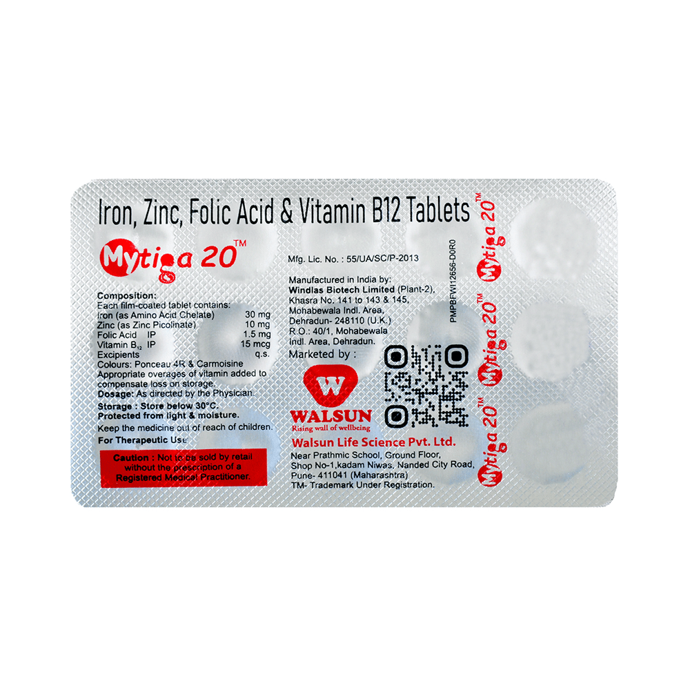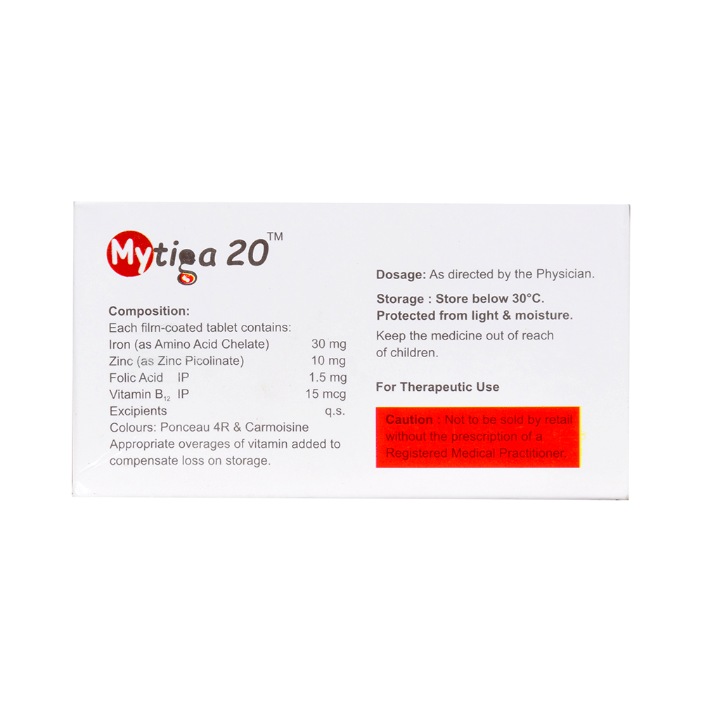 Mytiga 20 Tablet is a combination of vitamins and minerals. Iron replenishes the iron stores in the body and corrects iron deficiency anemia. Zinc is needed for the body's immune system to work properly. It plays a role in growth, wound healing, and maintaining gut health. Zinc is also needed for the senses of taste and smell. Folic acid is essential for production of red blood cells. It prevents and treats folate deficiency and anemia. When taken by pregnant women, Folic acid prevents miscarriage, preterm labor, and neural tube defects in infants. Vitamin B12 corrects vitamin B12 deficiency thereby helping in treating certain anemias and nerve problems.