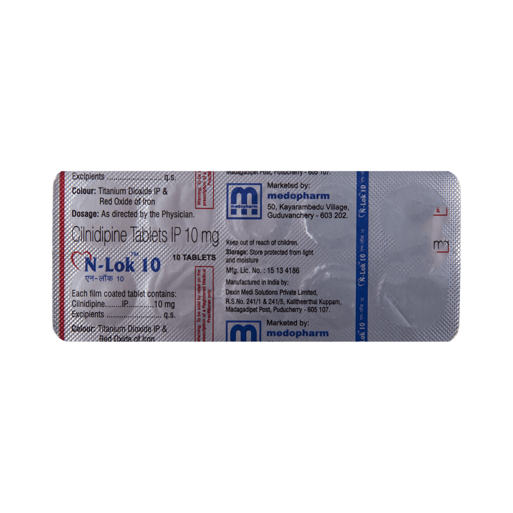 N-Lok 10 Tablet is a medicine used to treat high blood pressure (hypertension). It belongs to a class of medicines known as calcium channel blockers, which help to lower blood pressure. This helps prevent heart attacks and strokes. N-Lok 10 Tablet may be prescribed alone or along with other medicines. The dose depends on the severity of your condition. You can take it at any time of day, with or without food, but it is best to take it at the same time each day. Keep taking it for as long as advised by your doctor. Do not stop this medicine on your own, even if you feel well, because high blood pressure often has no symptoms. This makes it hard to identify any sudden spike, and if you stop taking it, your condition may get worse.Keeping active with regular exercise, reducing your weight, and eating a healthy diet will also help control your blood pressure. Follow your doctor’s advice while taking this medicine.The most common side effects include fatigue, edema (swelling in the feet), sleepiness, dizziness, flushing, unusual beating of the heart (palpitations), and headache. Consult your doctor if any of these bother you or do not go away. Side effects like swelling in the feet or ankles and palpitations are less severe than other similar medicines in the group. Studies have shown that it also has a protective effect on the kidneys.Before taking it, let your doctor know if you have any liver, kidney, or heart problems. Pregnant or breastfeeding women should also consult their doctor for advice before taking this medicine. You also need to tell your doctor what other medicines you are taking, especially those used to treat high blood pressure or heart conditions. You should have your blood pressure checked regularly to make sure that this medicine is working properly.