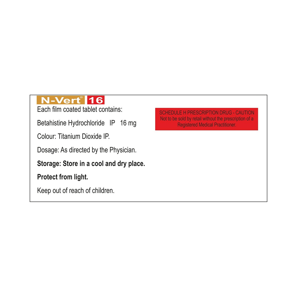 N-Vert 16 Tablet is used to prevent and treat a disorder of the inner ear known as Ménière’s disease. The symptoms include dizziness (vertigo), ringing in the ears (tinnitus), and loss of hearing, probably caused by fluid in the ear. This medicine helps relieve the symptoms by reducing the amount of fluid. N-Vert 16 Tablet should be swallowed whole with water and taken at the same time(s) each day to get the most benefit. Your doctor will decide what is the correct dose to relieve your symptoms and how often you need to take it. You may need to take this medicine for several months and you should take it for as long as prescribed by your doctor, even if you start feeling better. The most common side effects include headache, feeling sick, and indigestion (dyspepsia). You may also get stomach pain and bloating. Taking the medicine with food can help reduce stomach problems.  Before taking this medicine, you should talk to your doctor if you have a stomach ulcer, asthma, or high or low blood pressure. You must also tell him/her what other medicines you are taking, to make sure you are safe. Also speak to your doctor if you are pregnant, trying to become pregnant, or breastfeeding.
