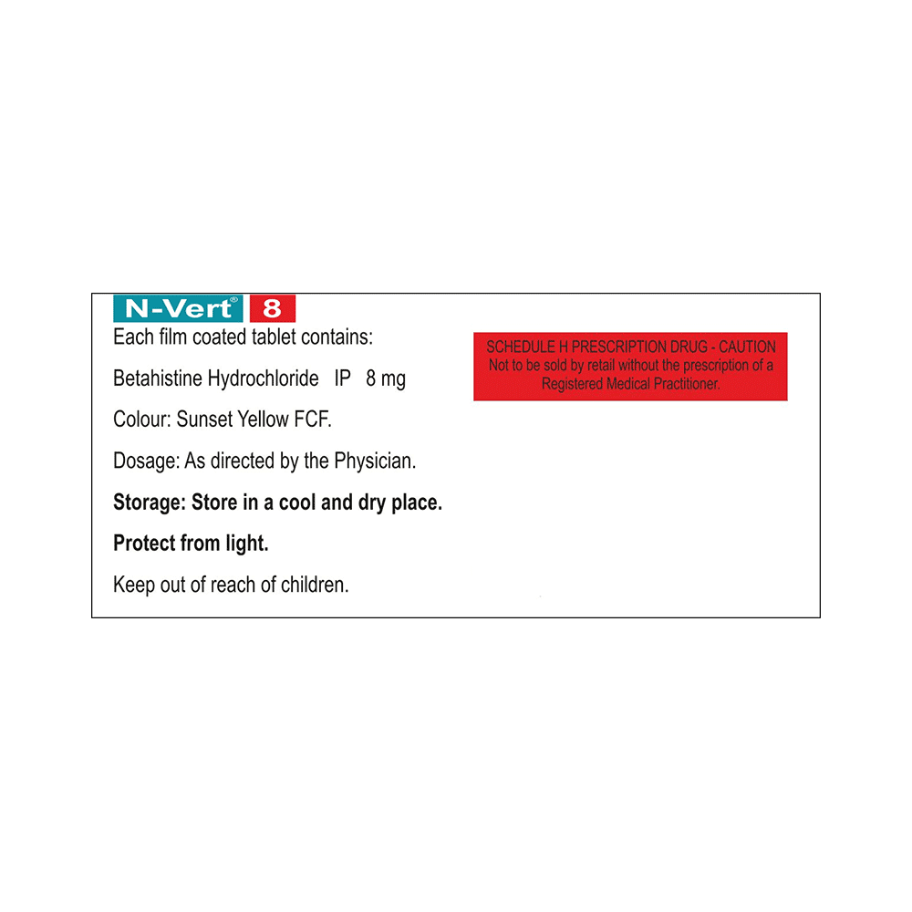 N-Vert 8 Tablet is used to prevent and treat a disorder of the inner ear known as Ménière’s disease. The symptoms include dizziness (vertigo), ringing in the ears (tinnitus), and loss of hearing, probably caused by fluid in the ear. This medicine helps relieve the symptoms by reducing the amount of fluid. N-Vert 8 Tablet should be swallowed whole with water and taken at the same time(s) each day to get the most benefit. Your doctor will decide what is the correct dose to relieve your symptoms and how often you need to take it. You may need to take this medicine for several months and you should take it for as long as prescribed by your doctor, even if you start feeling better. The most common side effects include headache, feeling sick, and indigestion (dyspepsia). You may also get stomach pain and bloating. Taking the medicine with food can help reduce stomach problems.  Before taking this medicine, you should talk to your doctor if you have a stomach ulcer, asthma, or high or low blood pressure. You must also tell him/her what other medicines you are taking, to make sure you are safe. Also speak to your doctor if you are pregnant, trying to become pregnant, or breastfeeding.