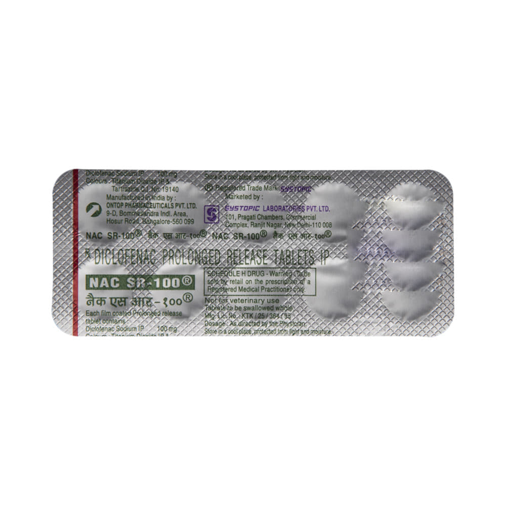 NAC SR 100 Tablet is a pain-relieving medicine. It is used to treat pain, swelling, stiffness, and joint pain in conditions like rheumatoid arthritis, osteoarthritis, and acute musculoskeletal injuries. It is commonly used in back pain, shoulder pain, neck pain, sprains, and spasms. NAC SR 100 Tablet should be taken in the dose and duration as advised by your doctor. It should be taken with food or milk to prevent stomach upset. Inform your doctor if you have any history of heart disease or stroke.The most common side effects of this medicine include nausea, vomiting, diarrhea, abdominal pain, indigestion, flatulence, decreased appetite, headache, and dizziness. Your doctor may also regularly monitor your kidney function, liver function, and levels of blood components if you are taking this medicine for long-term treatment. Long-term use may lead to serious complications such as stomach bleeding and kidney problems.NAC SR 100 Tablet should be used with precaution in patients with asthma and cardiovascular bleeding. This medicine is contraindicated for the treatment of perioperative pain in the setting of coronary artery bypass graft (CABG) surgery. Pregnant and breastfeeding women should consult their doctors before using this medicine as it may cause harmful effects to the developing baby.