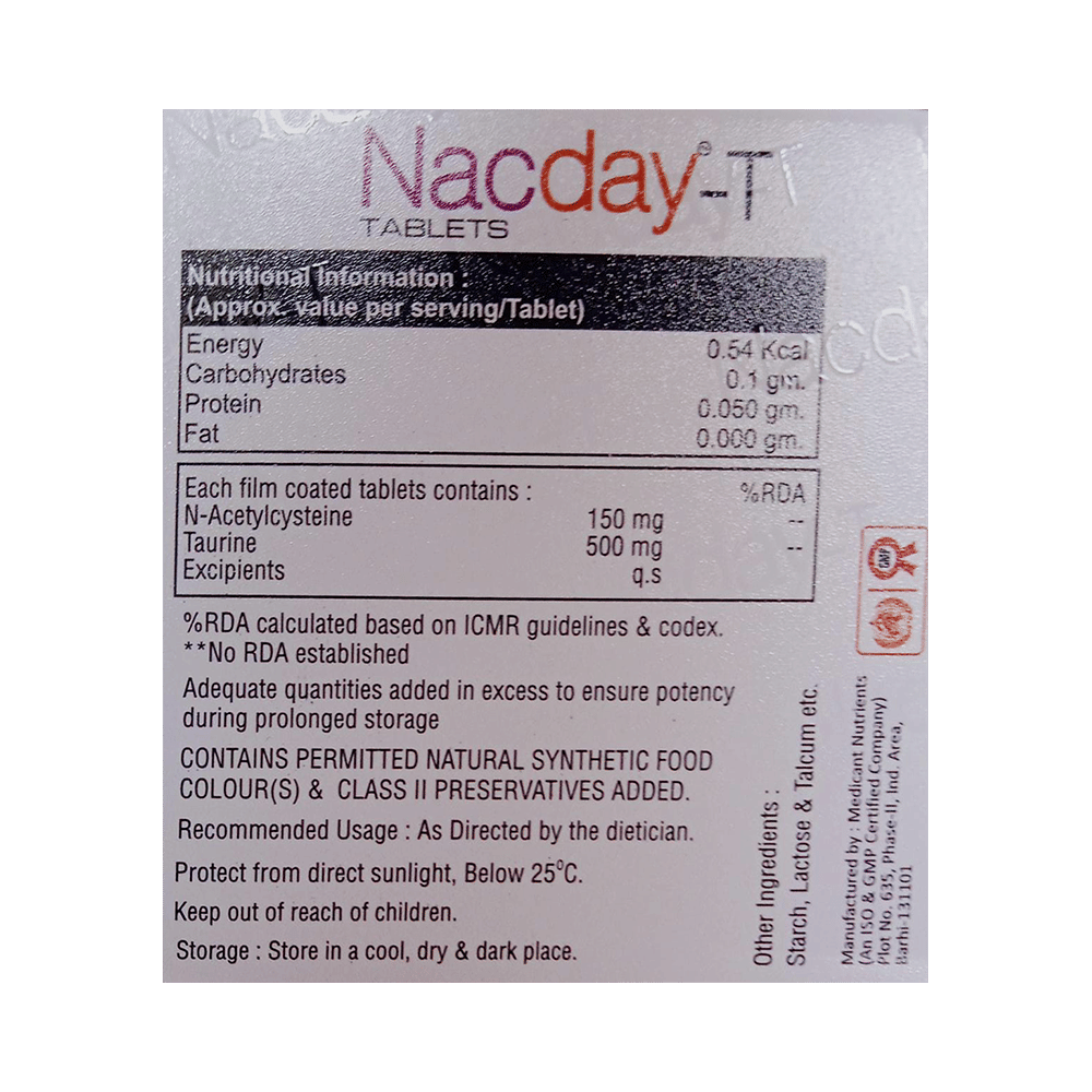 Nacday-T Tablet is a combination of two antioxidants: Taurine and Acetylcysteine. These antioxidants work by protecting the kidneys from damage by harmful chemical (free radicals).