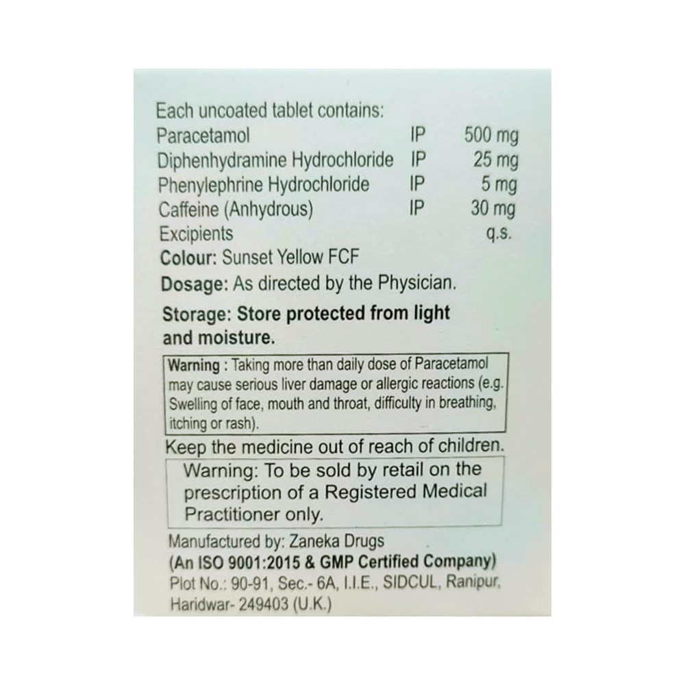 Salt Composition: Caffeine (30mg) + Diphenhydramine (25mg) + Paracetamol (500mg) + Phenylephrine (5mg)