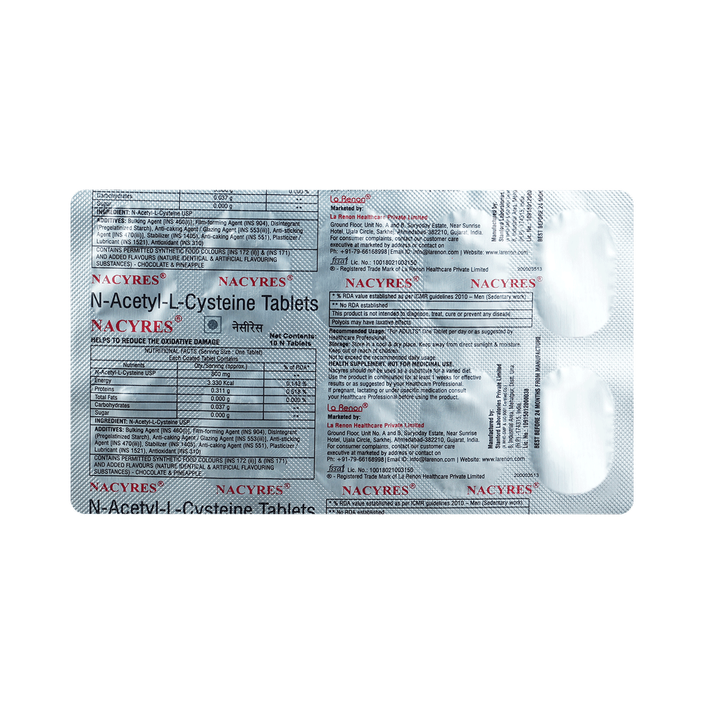 In Treatment of Respiratory disease with excessive mucusNacyres Tablet helps to loosen thick mucus, making it easier to cough out. This makes it easier for air to move in and out. It will relieve symptoms such as tightness in your chest, shortness of breath, wheezing, and coughing and help you carry out your daily activities more easily. This medicine is safe and effective. It usually starts to work within a few minutes and the effects can last up to several hours. Take it as prescribed by the doctor. Do not stop using it unless you are advised to by your doctor. Taking this medicine enables you to live your life more freely without worrying so much about things that set off your symptoms.