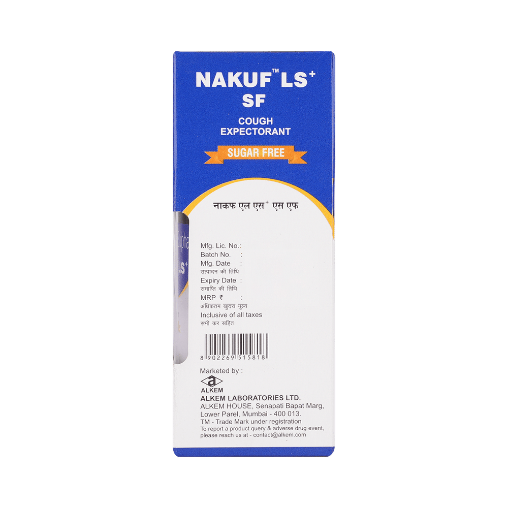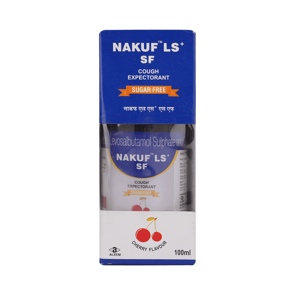 Nakuf LS+ SF Expectorant Cherry Sugar Free is a combination medicine used in the treatment of cough with mucus. It thins mucus in the nose, windpipe, and lungs, making it easier to cough out. It also provides relief from runny nose, sneezing, itching, and watery eyes. Nakuf LS+ SF Expectorant Cherry Sugar Free is taken with or without food in a dose and duration as advised by the doctor. The dose you are given will depend on your condition and how you respond to the medicine. You should keep taking this medicine for as long as your doctor recommends. If you stop treatment too early your symptoms may come back and your condition may worsen. Let your healthcare team know about all other medications you are taking as some may affect, or be affected by this medicine.The most common side effects are nausea, diarrhea, stomach pain, vomiting, muscle cramp, headache, skin rash, and increased heart rate. Most of these are temporary and usually resolve with time. Contact your doctor straight away if you are at all concerned about any of these side effects. This medicine can also cause sleepiness, so do not drive or do anything that requires mental focus until you know how this medicine affects you. Avoid drinking alcohol while taking this medicine as it can make sleepiness worse.Never support self-medication or recommend your medicine to another person. It is beneficial to have plenty of fluids while taking this medication. Before taking this medicine, you should tell your doctor if you are pregnant, planning pregnancy, or breastfeeding. You should also tell your doctor if you have any kidney or liver diseases so that your doctor can prescribe a suitable dose for you.