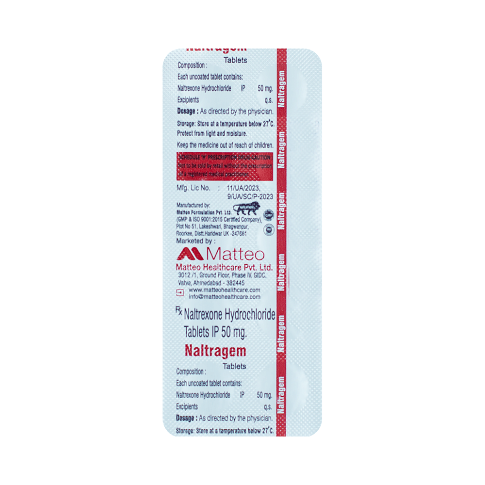 In Alcohol addictionNaltragem Tablet is a medicine used, along with social support and counseling, to help people recover from alcohol addiction and to avoid having the urge to drink alcohol again. Naltragem Tablet starts working from the very first dose and is a very safe and effective way of treating alcohol addiction. In Opioid dependenceOpioids are prescribed to treat pain. With prolonged use, the body may become dependent on them and cause withdrawal symptoms, which makes it difficult to stop taking them. Naltragem Tablet helps prevent these cravings that lead to opioid dependence and also helps the person to refrain from taking them repeatedly.show moreshow less