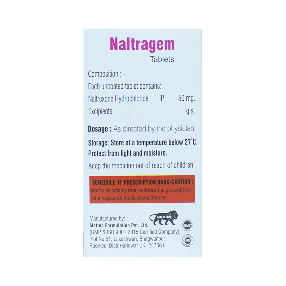 Naltragem Tablet is an opioid antagonist. It works by blocking the euphoric feelings (highs) that you may experience after taking opiates and alcohol. This reduces craving and helps you remain off of them.
