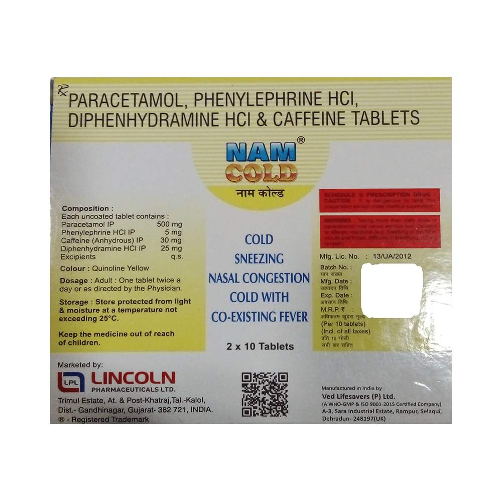 Nam Cold Tablet is a combination of four medicines: caffeine, diphenhydramine, paracetamol, and phenylephrine, which relieve common cold symptoms. Diphenhydramine is an antiallergic that relieves allergy symptoms like a runny nose, watery eyes, and sneezing. Paracetamol is an analgesic (pain reliever) and an antipyretic (fever reducer). It blocks the release of certain chemical messengers in the brain that are responsible for pain and fever. Caffeine increases the effectiveness of paracetamol and decreases the sleepiness caused by diphenhydramine. Phenylephrine is a decongestant that narrows the small blood vessels, providing temporary relief from congestion or stuffiness in the nose.
