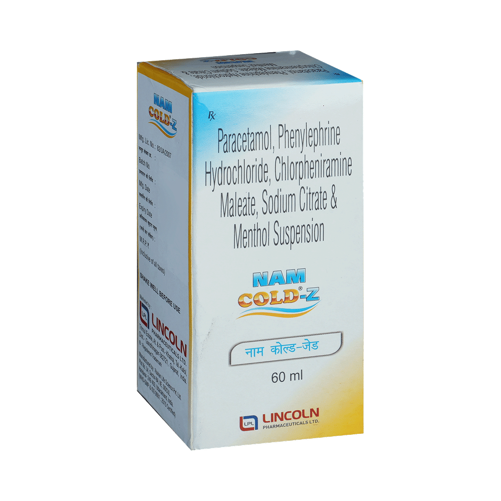 Nam Cold Z Syrup is used in the treatment of common cold and cough associated with fever in children. It provides relief from pain and fever and helps treat cough and common cold symptoms like runny nose, stuffy nose, and sneezing. Nam Cold Z Syrup is a combination of H1 antihistaminic (first generation), analgesic & antipyretic-PCM,, mucolytic, sympathomimetic-α1 (nasal), and menthol.