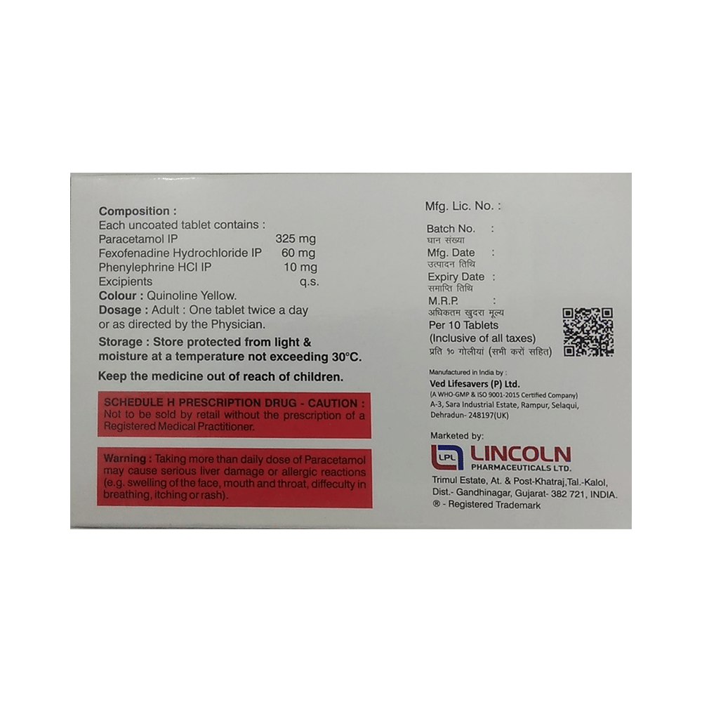 Salt Composition: Fexofenadine (60mg) + Phenylephrine (10mg) + Paracetamol (325mg)