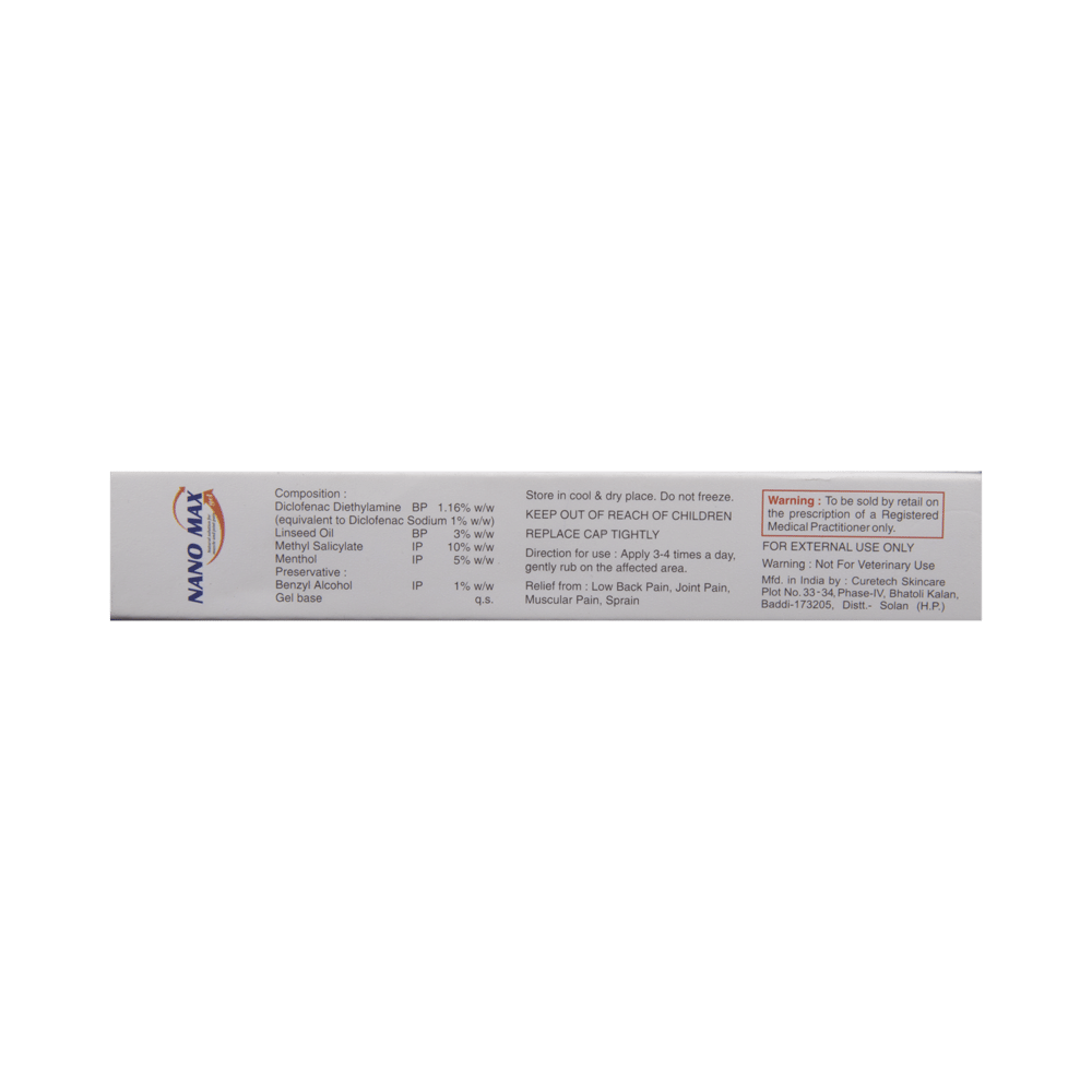 Nano Max Gel is a combination of four medicines: Diclofenac diethylamine, Linseed Oil, Methyl Salicylate and Menthol. Diclofenac diethylamine and Menthol are non-steroidal anti-inflammatory drugs (NSAIDs) which work by blocking the release of certain chemical messengers that cause pain and inflammation (redness and swelling). Linseed Oil is a plant-based oil which further reduces inflammation and improves blood circulation at the site of application. It also increases the penetration of Diclofenac diethylamine through the skin. Methyl Salicylate produces a cooling effect on the skin.