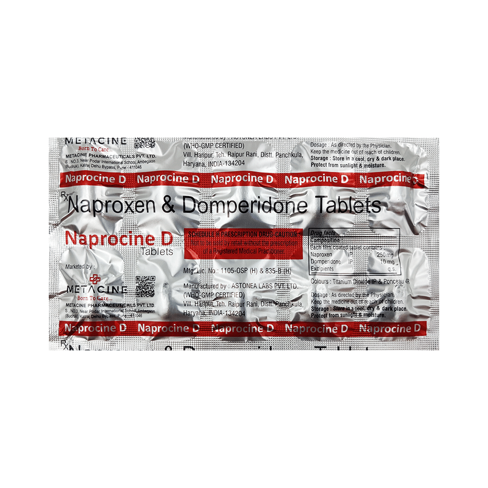 Naprocine D Tablet is a combination of two medicines: naproxen and domperidone. Naproxen is a non-steroidal anti-inflammatory drug (NSAID) that works by blocking the release of certain chemical messengers that cause pain due to migraine. Domperidone works on the region in the brain that controls vomiting associated with migraine. Together, they provide relief from migraine symptoms.