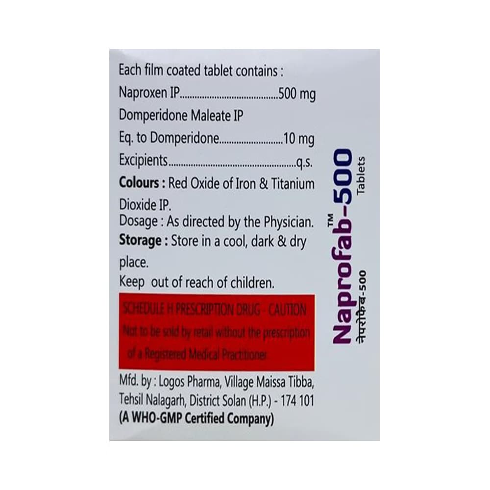 Naprofab 500 Tablet is a medicine used in the prevention of migraines. It inhibits the release of certain chemical messengers that cause pain, inflammation, and fever. It also blocks the signals in the brain that cause nausea and vomiting associated with migraines. Naprofab 500 Tablet may be prescribed alone or in combination with another medicine. It can be taken with or without food. The dose and duration will depend on the severity of your condition and how well it helps your symptoms. Use it regularly and do not discontinue it until the doctor tells you it is right to stop.Using Naprofab 500 Tablet may cause common side effects such as headaches, ringing in the ears, dizziness, tiredness, rashes, and vision changes. If you experience such side effects that do not go away or get worse, you should let your doctor know. Your doctor may be able to suggest ways of preventing or reducing the symptoms.In general, you should try to use the smallest amount necessary to control your symptoms. Before using the medicine, you should tell your doctor if you have any other illnesses or disorders. It may also affect, or be affected by, some other medicines you are using, so let your doctor know all the other medicines you are taking. Pregnant and breastfeeding women should consult their doctors first before using the medicine.
