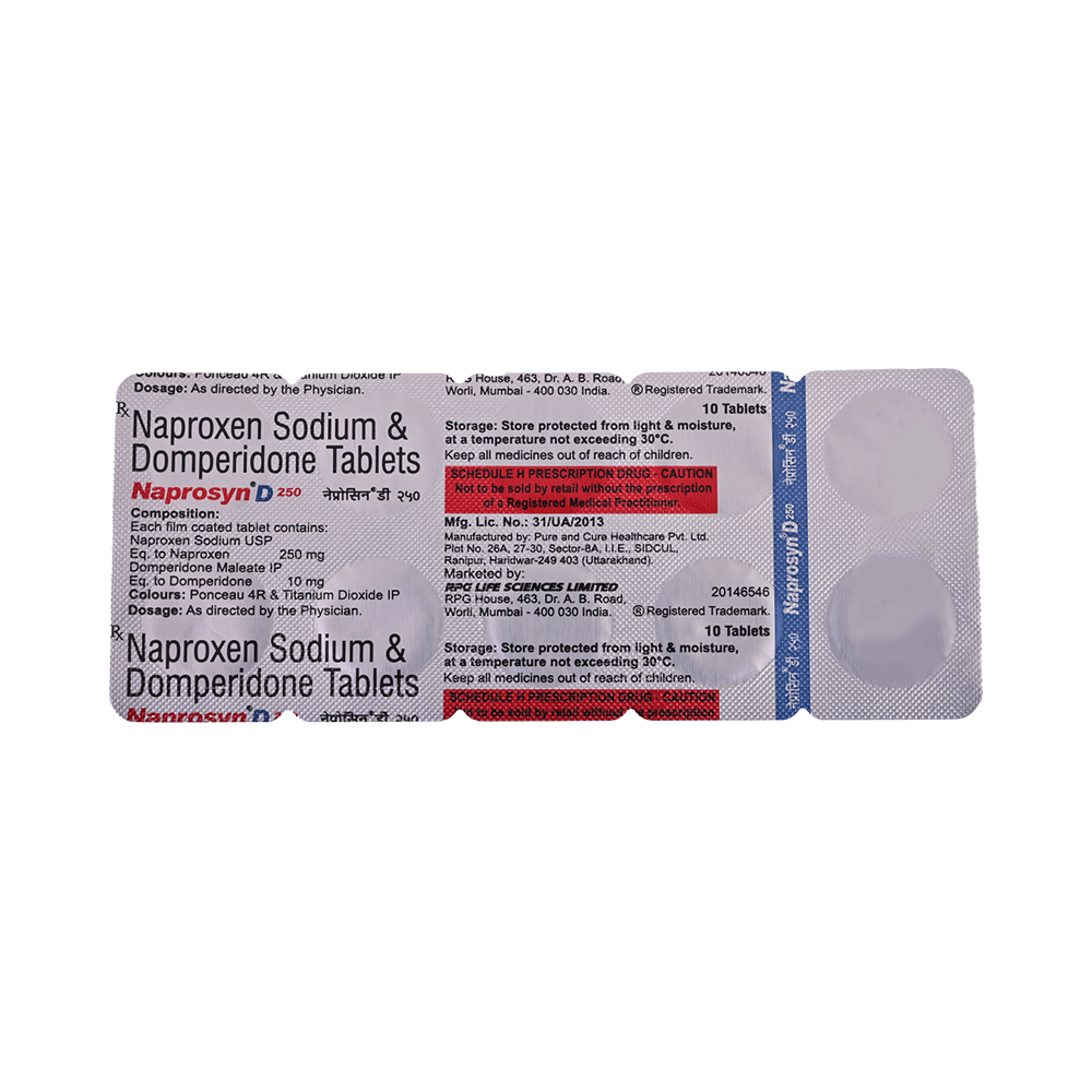 Naprosyn D 250 Tablet is a combination of two medicines: naproxen and domperidone. Naproxen is a non-steroidal anti-inflammatory drug (NSAID) that works by blocking the release of certain chemical messengers that cause pain due to migraine. Domperidone works on the region in the brain that controls vomiting associated with migraine. Together, they provide relief from migraine symptoms.