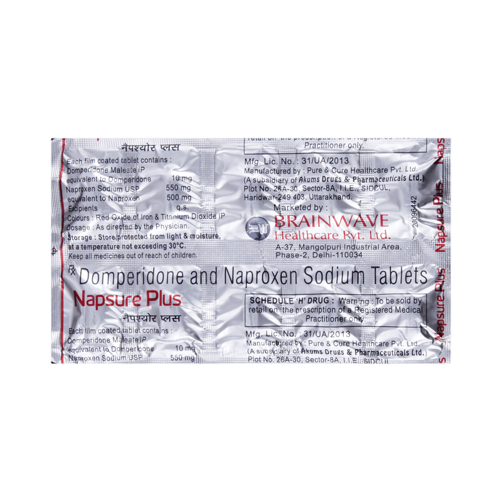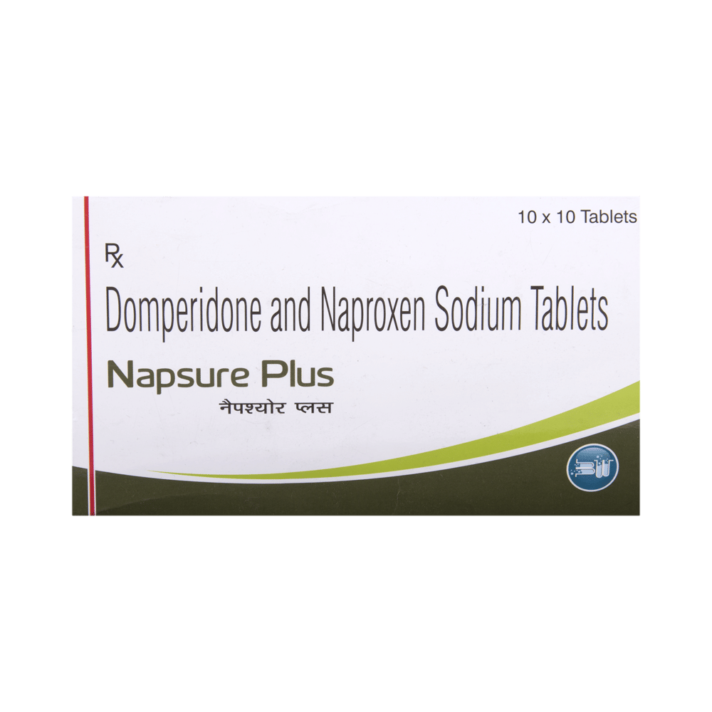 Napsure Plus Tablet is a combination of two medicines: naproxen and domperidone. Naproxen is a non-steroidal anti-inflammatory drug (NSAID) that works by blocking the release of certain chemical messengers that cause pain due to migraine. Domperidone works on the region in the brain that controls vomiting associated with migraine. Together, they provide relief from migraine symptoms.