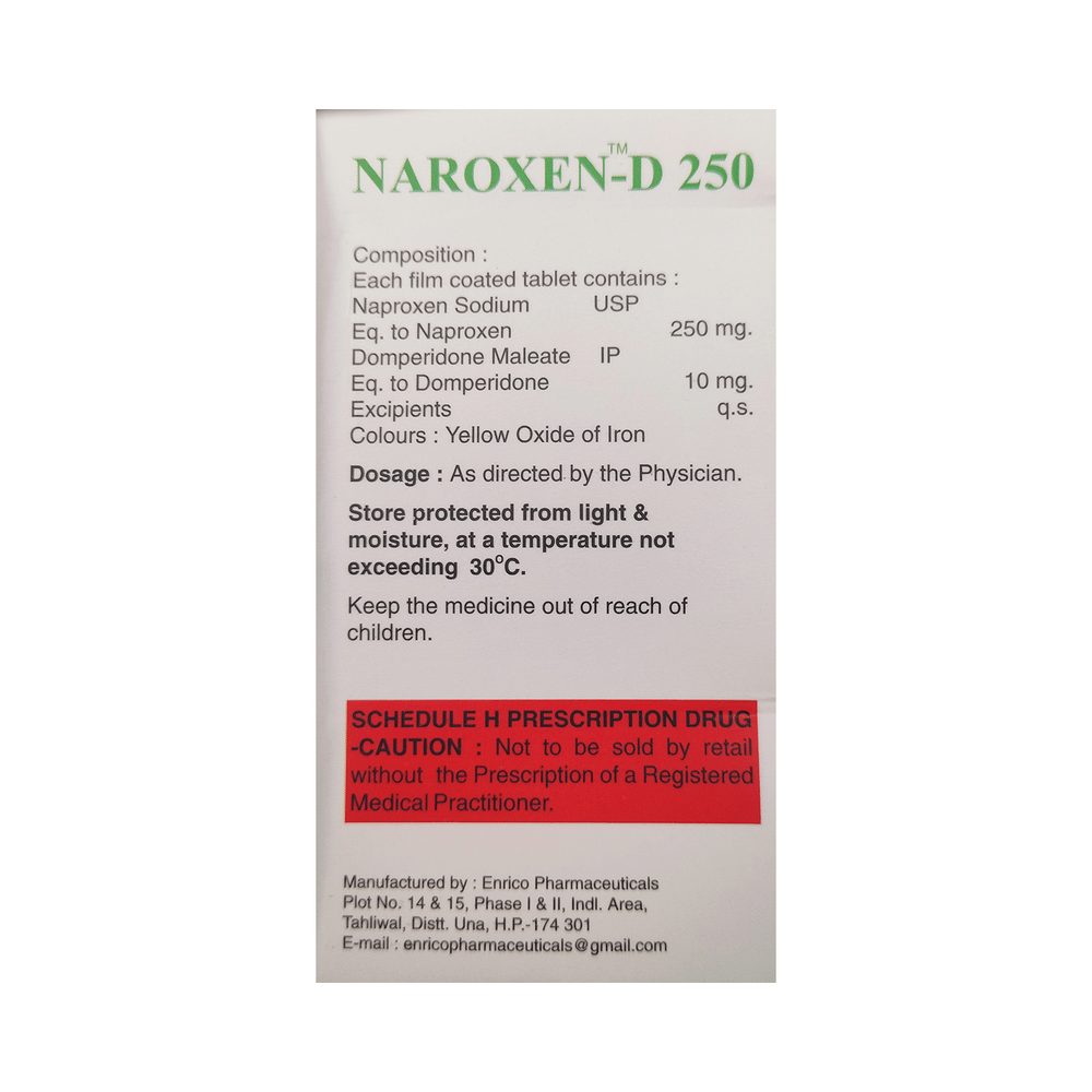 Take this medicine in the dose and duration as advised by your doctor. Swallow it as a whole. Do not chew, crush or break it. Naroxen-D 250 Tablet may be taken with or without food, but it is better to take it at a fixed time.